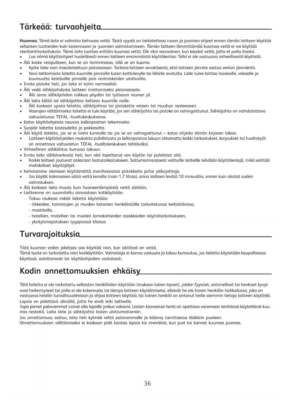 - Laitteenne on suunniteltu ainoastaan kotikäyttöön. Takuu raukeaa mikäli laitetta käytetään: - liikkeiden, toimistojen ja muiden laitosten henkilöstöille tarkoitetuissa keittiötiloissa, - maatiloilla, - hotellien, motellien tai muiden lomakohteiden asiakkaiden käyttötarkoitukseen, - yksityismajoituksen tyyppisissä tiloissa Turvarajoituksia Tätä kuuman veden jakelijaa saa käyttää vain, kun säiliössä on vettä. Tämä tuote on tarkoitettu vain kotikäyttöön. Valmistaja ei kanna vastuuta ja takuu kumoutuu, jos laitetta käytetään kaupallisessa käytössä, asiattomasti tai käyttöohjeiden vastaisesti. Kodin onnettomuuksien ehkäisy Tätä laitetta ei ole tarkoitettu sellaisten henkilöiden käyttöön (mukaan lukien lapset), joiden fyysiset, aistimelliset tai henkiset kyvyt ovat heikentyneet tai joilla ei ole kokemusta tai tietoja laitteen käyttämiseksi, elleivät he ole toisen henkilön tarkkailussa, joka on vastuussa heidän turvallisuudestaan ja ohjaa laitteen käyttöä, tai toinen henkilö on antanut heille aiemmin tietoja laitteen käytöstä. Lapsia on pidettävä silmällä, jotta he eivät leiki laitteella Jopa pienet palovammat voivat olla lapsille joskus vakavia. Lasten kasvaessa heitä on opettava varomaan keittiössä käytettäviä kuu- mia nesteitä. Laita laite ja sähköjohto lasten ulottumattomiin. Jos onnettomuus sattuu, laita heti kylmää vettä palovammalle ja käänny tarvittaessa lääkärin puoleen. Onnettomuuksien välttämiseksi ei koskaan pidä kantaa lapsia tai imeväisiä, kun juot tai kannat kuumaa juomaa.
