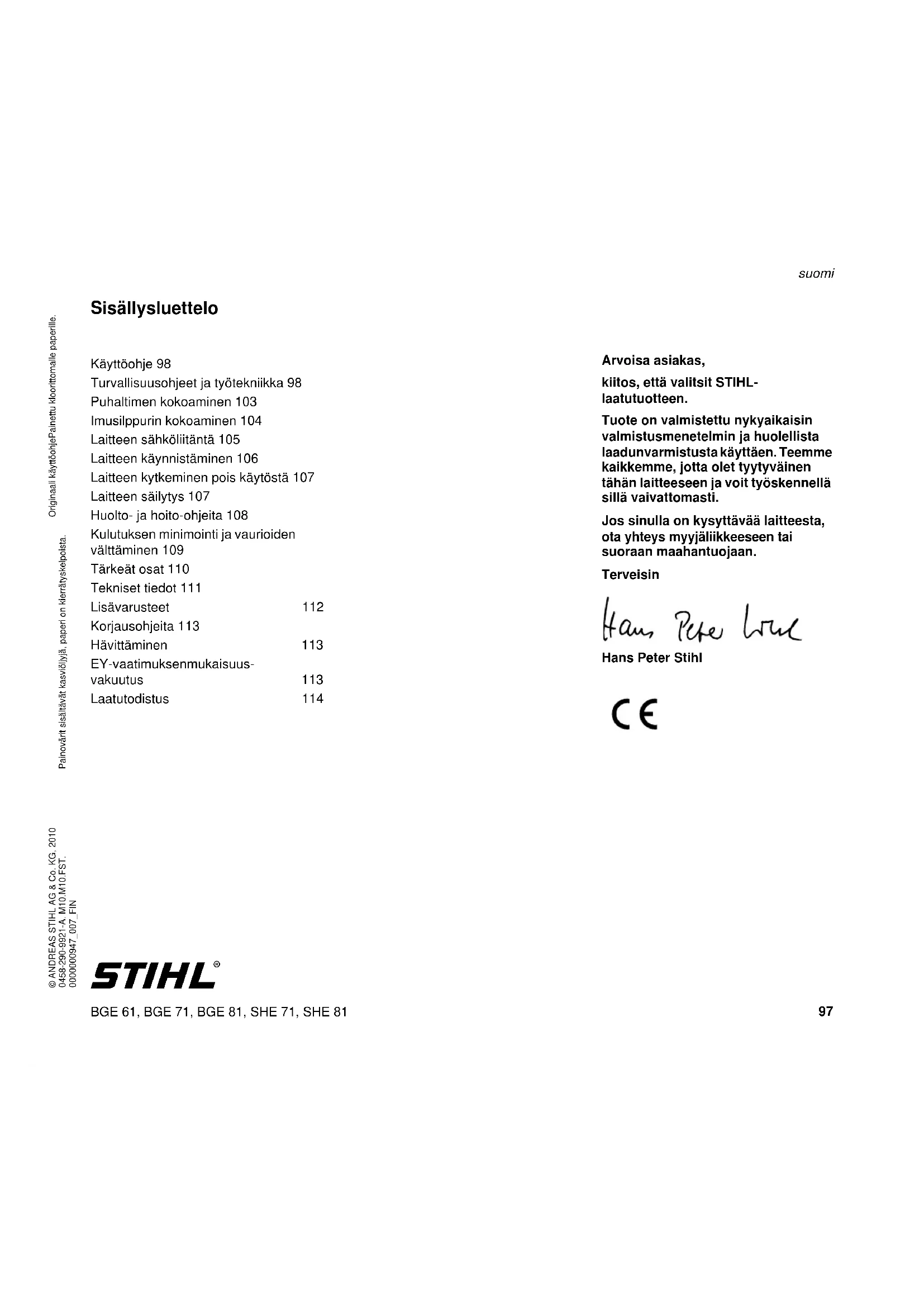 Sisällysluettelo Arvoisa asiakas, kiitos, että valitsit STIHL- laatutuotteen. Tuote on valmistettu nykyaikaisin valmistusmenetelmin ja huolellista laadunvarmistusta käyttäen. Teemme kaikkemme, jotta olet tyytyväinen tähän laitteeseen ja voit työskennellä sillä vaivattomasti. Jos sinulla on kysyttävää laitteesta, ota yhteys myyjäliikkeeseen tai suoraan maahantuojaan. Terveisin Hans Peter Stihl Käyttöohje 98 Turvallisuusohjeet ja työtekniikka 98 Puhaltimen kokoaminen 103 Imusilppurin kokoaminen 104 Laitteen sähköliitäntä 105 Laitteen käynnistäminen 106 Laitteen kytkeminen pois käytöstä 107 Laitteen säilytys 107 Huolto- ja hoito-ohjeita 108 Kulutuksen minimointi ja vaurioiden välttäminen 109 Tärkeät osat 110 Tekniset tiedot 111 Lisävarusteet 112 Korjausohjeita 113 Hävittäminen 113 EY-vaatimuksenmukaisuus- vakuutus 113 Laatutodistus 114BGE 61, BGE 71, BGE 81, SHE 71, SHE 81 suomi