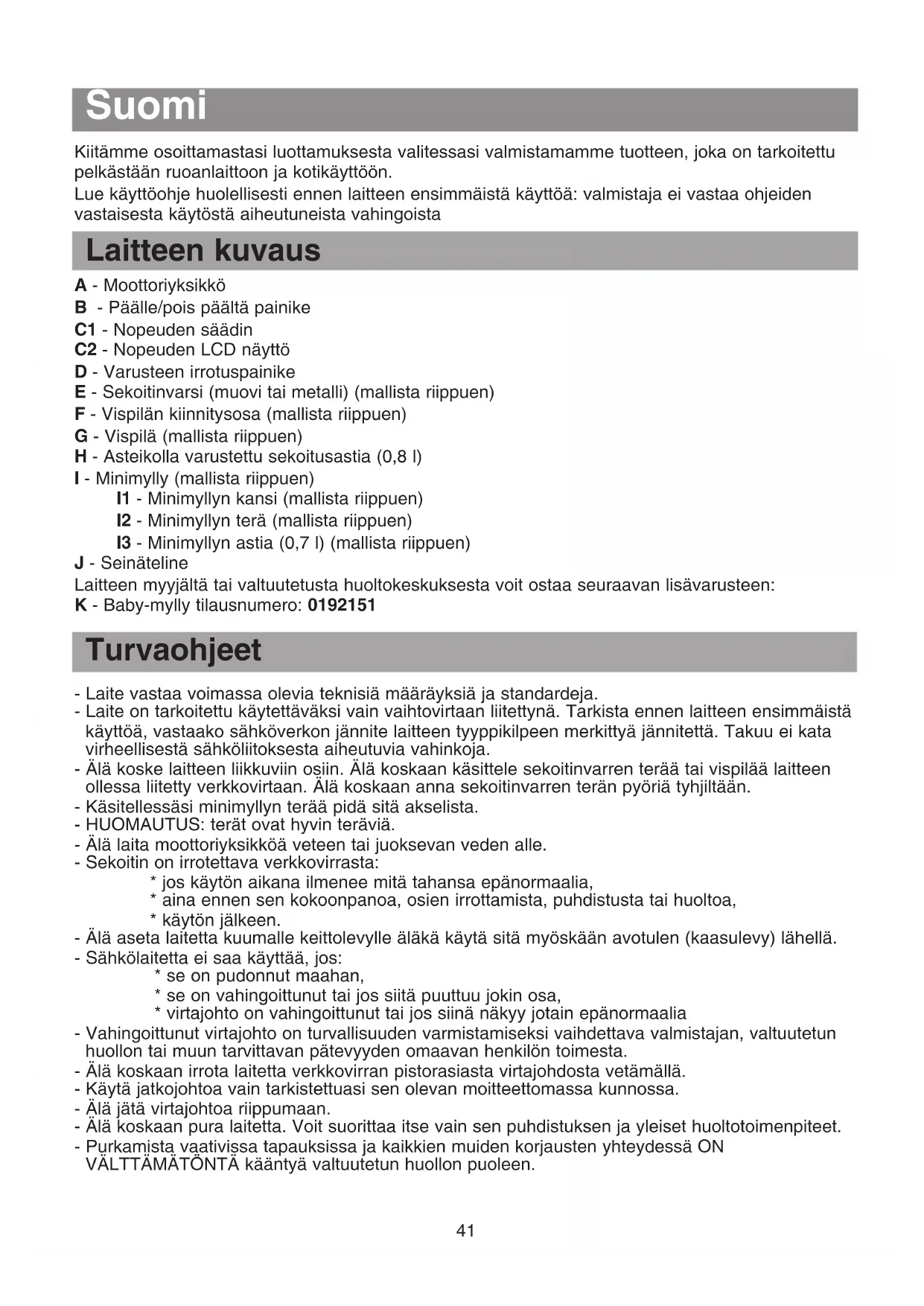 - virtajohto on vahingoittunut tai jos siinä näkyy jotain epänormaalia - Vahingoittunut virtajohto on turvallisuuden varmistamiseksi vaihdettava valmistajan, valtuutetun huollon tai muun tarvittavan pätevyyden omaavan henkilön toimesta. - Älä koskaan irrota laitetta verkkovirran pistorasiasta virtajohdosta vetämällä. - Käytä jatkojohtoa vain tarkistettuasi sen olevan moitteettomassa kunnossa. - Älä jätä virtajohtoa riippumaan. - Älä koskaan pura laitetta. Voit suorittaa itse vain sen puhdistuksen ja yleiset huoltotoimenpiteet. - Purkamista vaativissa tapauksissa ja kaikkien muiden korjausten yhteydessä ON VÄLTTÄMÄTÖNTÄ kääntyä valtuutetun huollon puoleen. hanovre 2544615 6/04/06 14:33 Page 4142 - Laite on tarkoitettu kotikäyttöön, sitä ei saa missään tapauksessa käyttää amm attilaistarkoituksiin. Sellaisessa tapauksessa valmistajan antama takuu ei ole voimassa eikä valmistaja ole vastuussa mahdollisesti aiheutuvista vahingoista. - Henkilöt, joiden fyysiset tai henkiset kyvyt eivät mahdollista laitteen turvallista käyttöä, eivät saa käyttää sitä ilman apua tai valvontaa. - Tämä laite ei ole lelu. Älä jätä sitä lasten ulottuville äläkä anna lasten leikkiä sillä. - Älä käytä sekoitinvartta tai vispilää minimyllyn astiassa. Käyttöönotto Pese laitteen varusteet vedellä ja astianpesuaineella ennen laitteen ensimmäistä käyttökertaa. Huuhtele ja kuivaa kunnolla. HUOMAUTUS: terät ovat hyvin teräviä Sekoitinvarren käyttö: Asenna sekoitinvarsi (E) moottoriyksikköön (A) niin, että kuulet naksahduksen. Sekoitin on ideaalinen kastikkeiden, keittojen, juomasekoitusten, pirtelöiden, majoneesien, ohukaistaikinan, vohvelitaikinan ja lastenruokien valmistukseen. Välttääksesi ainesten roiskumista upota ensin sekoitinvarsi aineksiin, liitä laite verkkovirtaan ja paina painiketta päälle/pois päältä (B). Säädä säätimellä (C1) nopeus joka näkyy LCD näytössä (C2). Ainesten sekoittumisen tehostamiseksi tee kiertäviä liikkeitä alhaalta ylöspäin. Käytön jälkeen irrota laite verkkovirrasta, paina varusteen irrotuspainiketta (D) ja irrota sekoitinvarsi. Vispilän käyttö: Työnnä vispilä (G) sen kiinnitysosaan (F) ja asenna se moottoriyksikköön (A) niin, että kuulet naksahduksen. Vispilällä voi sekoittaa ohuita seoksia (ohukaistaikina, valkuaisvaahto, kermavaahto….). Liitä laite verkkovirtaan ja paina painiketta päälle/pois päältä (B). Säädä säätimellä (C1) nopeus joka näkyy LCD näytössä (C2). Laitteen verkkovirrasta irrotuksen jälkeen paina varusteen irrotuspainiketta (D) ja irrota vispilä. Minimyllyn käyttö: Ennen minimyllyn käyttöä: 1 – Aseta terä (I2) (teräsuojan poistamisen jälkeen) varovasti astiaan (I3) keskiakselille. Älä unoh da asentaa teräsuojaa takaisin käytön jälkeen. 2 – Laita ainekset astiaan. 3 – Aseta kansi (I1) astian päälle ja kannen (I1) päälle moottoriyksikkö (A). 4 – Liitä laite verkkovirtaan ja paina painiketta päälle/pois päältä (B). Säädä säätimellä (C1) nopeus joka näkyy LCD näytössä (C2). Minimyllyllä voi silputa persiljaa, mausteita, lihaa (150 g), hasselpähkinöitä (125 g), sämpylöitä, lastenruokia…. Astian (I3) saa täyttää korkeintaan 2/3 tasolle. Liitä laite verkkovirtaan ja paina painiketta (B) tai (C). Mikroaaltouunin käyttö: Juoksevia aineita (keittoja,…) voidaan lämmittää myllyn astiassa mikroaaltouunissa edellyttäen, ettei ruokaan ole lisätty rasvaa ja että astian metalliakseli on kokonaan ruoan peittämä. hanovre 2544615 6/04/06 14:33 Page 4243 Käytännöllisiä neuvoja - Sekoitukseen tai vispaukseen käytettävän astian saa täyttää korkeintaan 2/3 tasolle, etteivät ainekset valuisi astian reunojen yli. - Jotta sekoitus olisi tehokasta, on ainesten peitettävä vähintään sekoitinvarren alaosa. - Poista lihasta luut ja jänteet ennen sen laittamista astiaan. - Ennen kuumien ainesten sekoittamista poista keittoastia lämpölähteestä. Anna keitettyjen ainesten osittain jäähtyä ennen niiden laittamista astiaan. - Älä sekoita aineksia tai juoksevia aineita, joiden lämpötila ylittää 80°C (175°F). - Sekoittaessasi kuitupitoisia aineksia (purjo, selleri, parsa jne.) puhdista sekoitinvars säännöllisesti sekoituksen aikana osien irrotusta ja puhdistusta koskevien turvaohjeiden mukaan. - Sekoittaessasi hedelmiä paloittele hedelmät ja poista niistä kivet ennen astiaan laittamista. - Älä käytä laitetta kovien ainesten kuten kahvinpapujen, jääkuutioiden, sokerin, viljan tai suklaan murskaukseen. - Älä käytä sekoitinvartta tai vispilää minimyllyn astiassa. - Käytettävän varusteen tyypistä riippumatta on laitteen annettava seisoa 60 sekunnin ajan ennen seuraavaa pitempää käyttöä. Ruokaohjeet Majoneesi: sekoitinvarsi, 10 sekuntia nopeudella 5 Vihanneskeitto: sekoitinvarsi, 30 sekuntia nopeudella 6 Ohukaistaikina: vispilä, 60 sekuntia nopeudella 2 Kermavaahto: vispilä, 2 minuuttia nopeudella 4 Minimylly Käytä lyhytaikaisia käynnistyksiä kunnes tulos on haluttu. nopeudella 6 Baby-mylly nopeudella 6 Laita asteikolla varustettuun sekoitusastiaan (H) 1 keltuainen, 1 ruokalusikallinen sinappia, 1 ruokalusikallinen etikkaa, suolaa, pip- puria. Aloita sekoitus ja lisää vähitellen 1/4 litraa öljyä liikuttaen samalla sekoitinvartta ylös ja alas. Keitä höyryssä painekattilassa 500 g perunoita, 400 g porkkanoita, 1 purjo, suolaa, pippuria, 1,8 litraa vettä. Sekoita lopuksi kaikki ainekset. 200 g jauhoa, hyppysellinen suolaa, 1/2 litraa maitoa, 40 g sulatettua voita, 3 munaa. 2 pussia pölysokeria, 200 g kermaa. Mantelit (125 g) 15 s Korput (40 g) 10 s Persilja (30 g) 5 s Kinkku (150 g) 8 s Neljään osaan leikatut sipulit (200 g) 6 s Tällä lisävarusteella voidaan jauhaa 45 g sianlihaa (rintapala) 3 sekunnissa. Laitteen puhdistus - HUOMAUTUS: terät ovat hyvin teräviä. - Irrota laite verkkovirrasta aina ennen puhdistusta. - Älä laita laitet