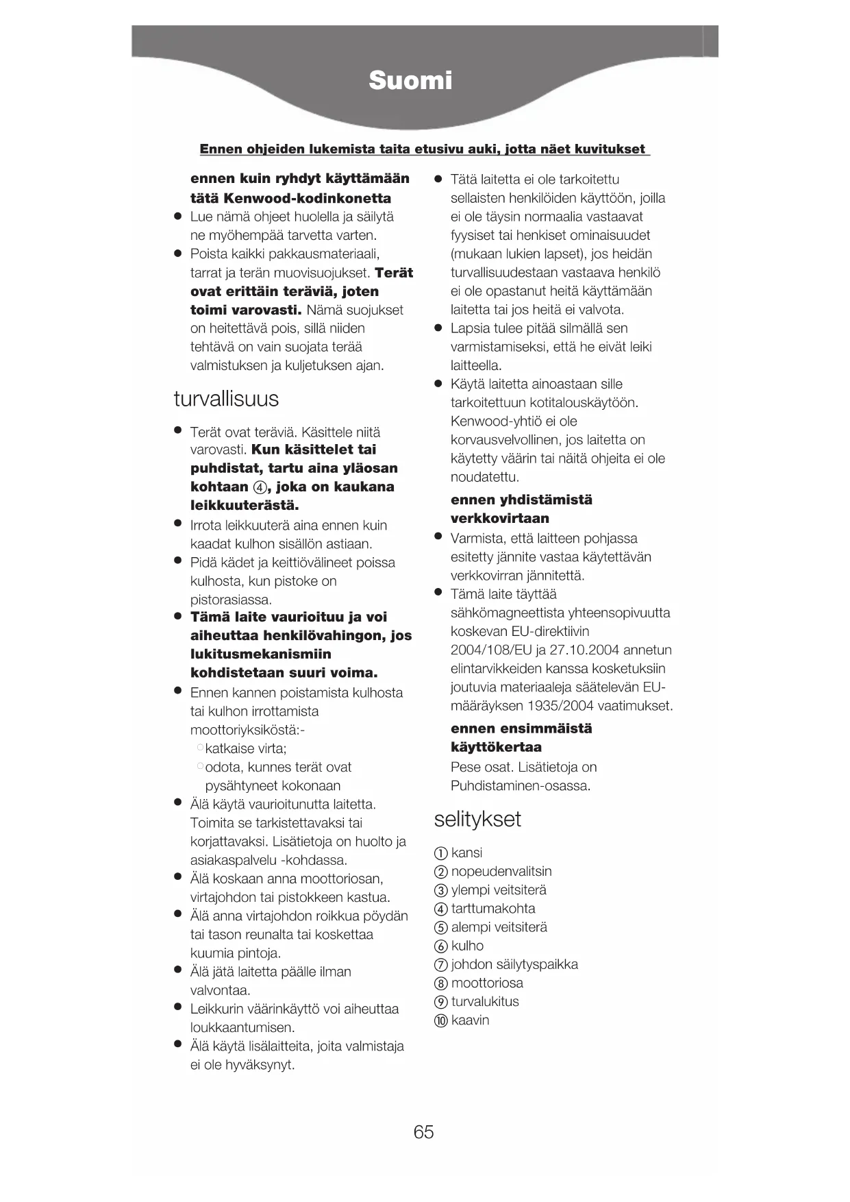 Tämä laite täyttää sähkömagneettista yhteensopivuutta koskevan EU-direktiivin 2004/108/EU ja 27.10.2004 annetun elintarvikkeiden kanssa kosketuksiin joutuvia materiaaleja säätelevän EU- määräyksen 1935/2004 vaatimukset. ennen ensimmäistä käyttökertaa Pese osat. Lisätietoja on Puhdistaminen-osassa. selitykset kansi nopeudenvalitsin ylempi veitsiterä tarttumakohta alempi veitsiterä kulho johdon säilytyspaikka moottoriosa turvalukitus kaavin Suomi