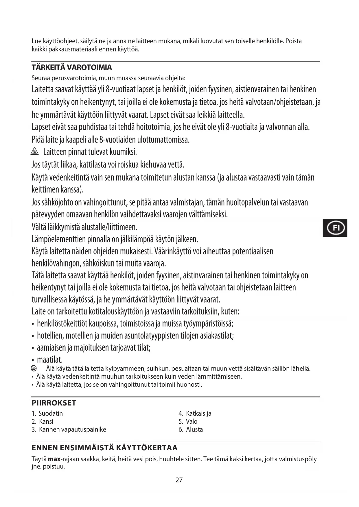Seuraa perusvarotoimia, muun muassa seuraavia ohjeita: Laitetta saavat käyttää yli 8-vuotiaat lapset ja henkilöt, joiden fyysinen, aistienvarainen tai henkinen toimintakyky on heikentynyt, tai joilla ei ole kokemusta ja tietoa, jos heitä valvotaan/ohjeistetaan, ja he ymmärtävät käyttöön liittyvät vaarat. Lapset eivät saa leikkiä laitteella. Lapset eivät saa puhdistaa tai tehdä hoitotoimia, jos he eivät ole yli 8-vuotiaita ja valvonnan alla. Pidä laite ja kaapeli alle 8-vuotiaiden ulottumattomissa. h Laitteen pinnat tulevat kuumiksi. Jos täytät liikaa, kattilasta voi roiskua kiehuvaa vettä. Käytä vedenkeitintä vain sen mukana toimitetun alustan kanssa (ja alustaa vastaavasti vain tämän keittimen kanssa). Jos sähköjohto on vahingoittunut, se pitää antaa valmistajan, tämän huoltopalvelun tai vastaavan pätevyyden omaavan henkilön vaihdettavaksi vaarojen välttämiseksi. Vältä läikkymistä alustalle/liittimeen. Lämpöelementtien pinnalla on jälkilämpöä käytön jälkeen. Käytä laitetta näiden ohjeiden mukaisesti. Väärinkäyttö voi aiheuttaa potentiaalisen henkilövahingon, sähköiskun tai muita vaaroja. Tätä laitetta saavat käyttää henkilöt, joiden fyysinen, aistinvarainen tai henkinen toimintakyky on heikentynyt tai joilla ei ole kokemusta tai tietoa, jos heitä valvotaan tai ohjeistetaan laitteen turvallisessa käytössä, ja he ymmärtävät käyttöön liittyvät vaarat. Laite on tarkoitettu kotitalouskäyttöön ja vastaaviin tarkoituksiin, kuten: