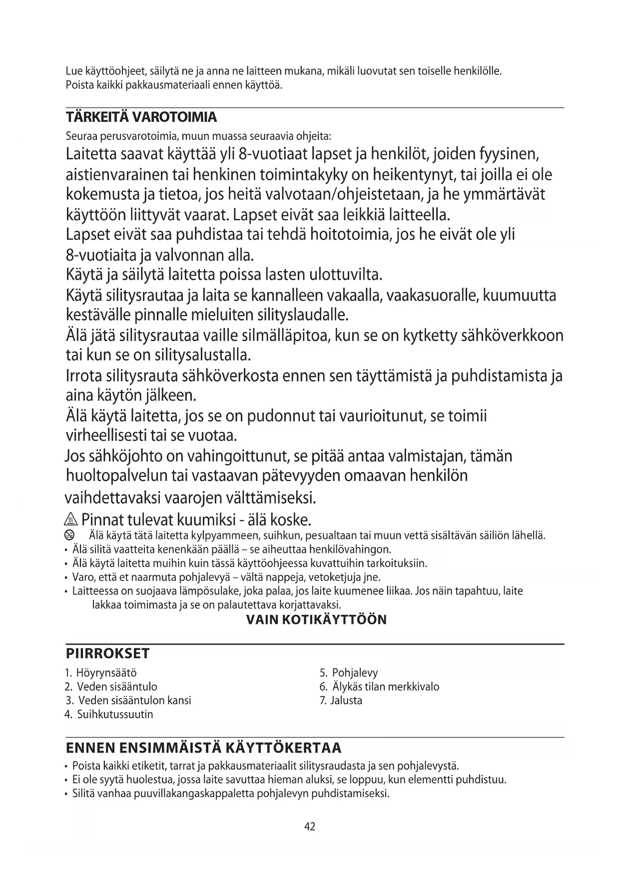 Seuraa perusvarotoimia, muun muassa seuraavia ohjeita: Laitetta saavat käyttää yli 8-vuotiaat lapset ja henkilöt, joiden fyysinen, aistienvarainen tai henkinen toimintakyky on heikentynyt, tai joilla ei ole kokemusta ja tietoa, jos heitä valvotaan/ohjeistetaan, ja he ymmärtävät käyttöön liittyvät vaarat. Lapset eivät saa leikkiä laitteella. Lapset eivät saa puhdistaa tai tehdä hoitotoimia, jos he eivät ole yli 8-vuotiaita ja valvonnan alla. Käytä ja säilytä laitetta poissa lasten ulottuvilta. Käytä silitysrautaa ja laita se kannalleen vakaalla, vaakasuoralle, kuumuutta kestävälle pinnalle mieluiten silityslaudalle. Älä jätä silitysrautaa vaille silmälläpitoa, kun se on kytketty sähköverkkoon tai kun se on silitysalustalla. Irrota silitysrauta sähköverkosta ennen sen täyttämistä ja puhdistamista ja aina käytön jälkeen. Älä käytä laitetta, jos se on pudonnut tai vaurioitunut, se toimii virheellisesti tai se vuotaa. Jos sähköjohto on vahingoittunut, se pitää antaa valmistajan, tämän huoltopalvelun tai vastaavan pätevyyden omaavan henkilön vaihdettavaksi vaarojen välttämiseksi. h Pinnat tulevat kuumiksi - älä koske. b Älä käytä tätä laitetta kylpyammeen, suihkun, pesualtaan tai muun vettä sisältävän säiliön lähellä.