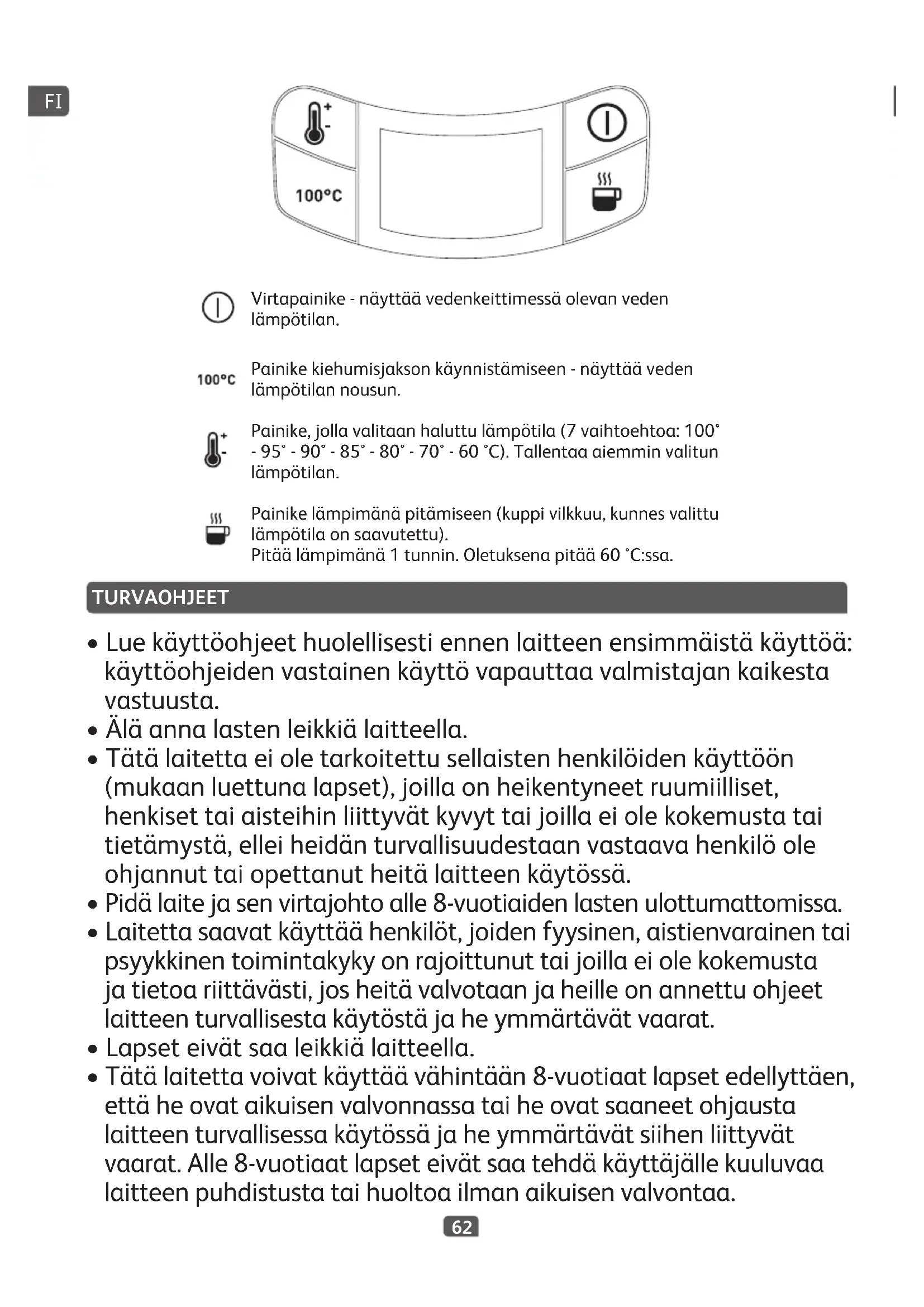 TURVAOHJEET Virtapainike-näyttäävedenkeittimessäolevanveden lämpötilan. Painikekiehumisjaksonkäynnistämiseen-näyttääveden lämpötilannousun. Painike,jollavalitaanhaluttulämpötila(7vaihtoehtoa:100° -95°-90°-85°-80°-70°-60°C).Tallentaaaiemminvalitun lämpötilan. Painikelämpimänäpitämiseen(kuppivilkkuu,kunnesvalittu lämpötilaonsaavutettu). Pitäälämpimänä1tunnin.Oletuksenapitää60°C:ssa.63
