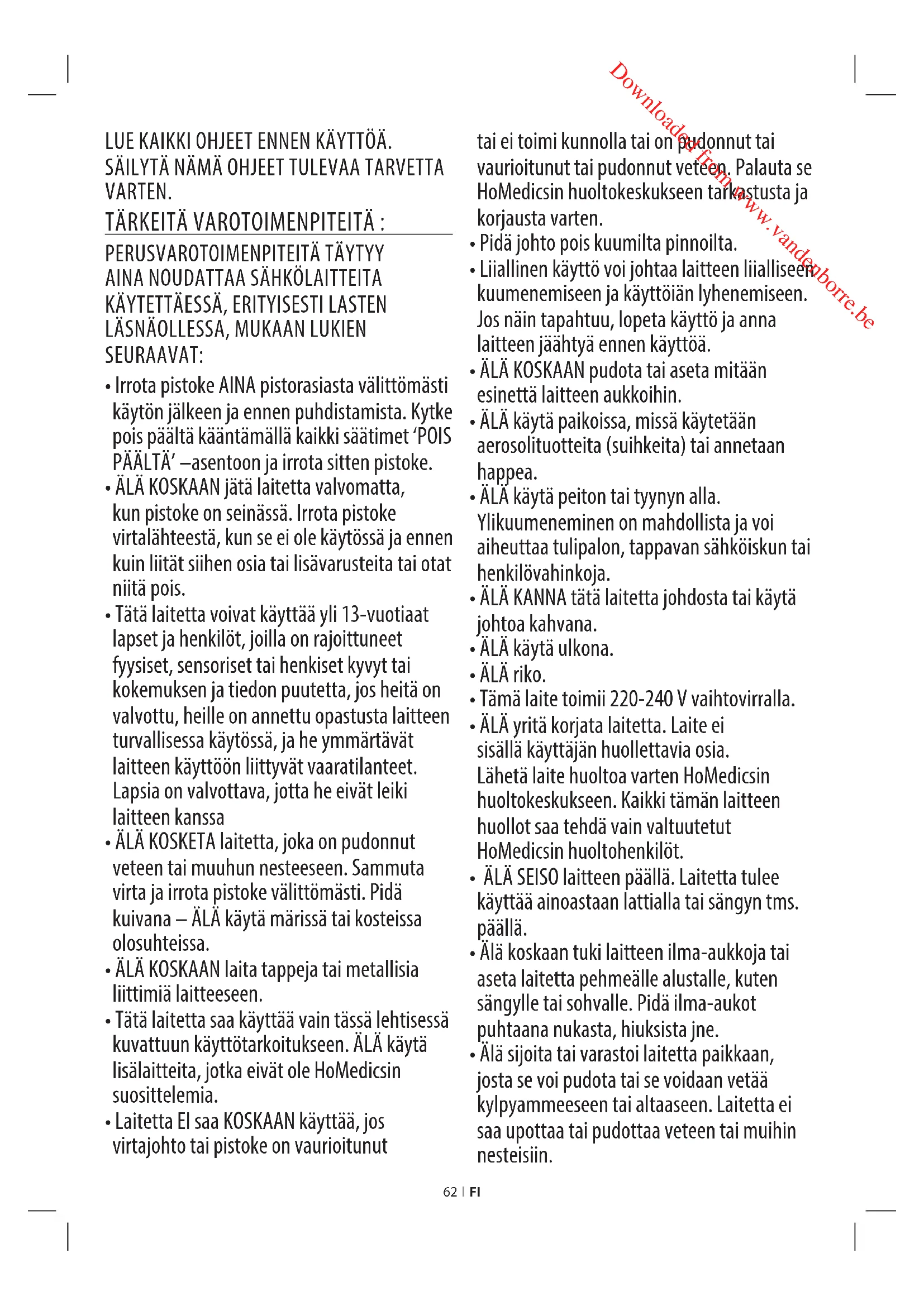 - Laitetta EI saa KOSKAAN käyttää, jos virtajohto tai pistoke on vaurioitunut tai ei toimi kunnolla tai on pudonnut tai vaurioitunut tai pudonnut veteen. Palauta se HoMedicsin huoltokeskukseen tarkastusta ja korjausta varten.