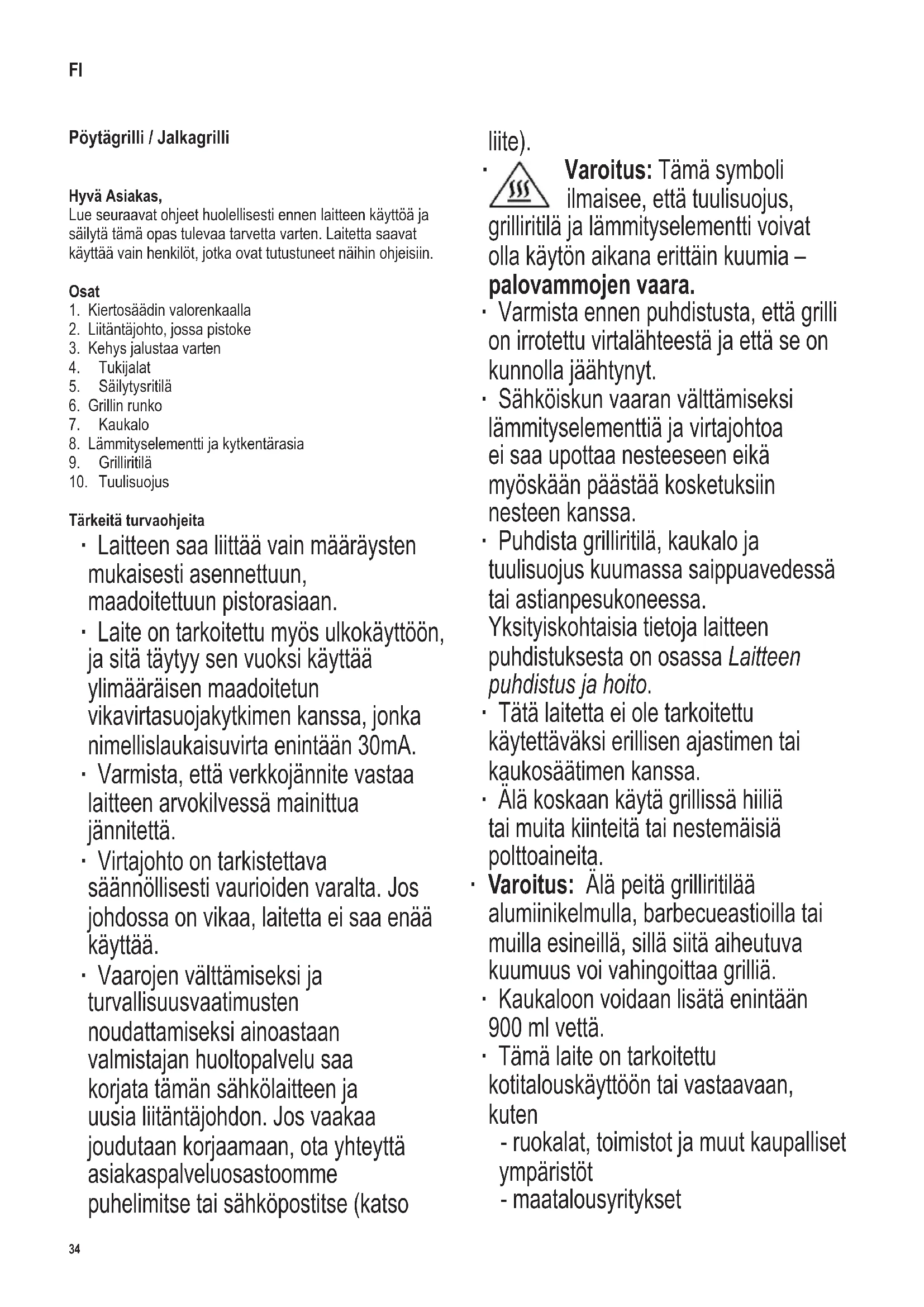 Varoitus: Tämä symboli ilmaisee, että tuulisuojus, grilliritilä ja lämmityselementti voivat olla käytön aikana erittäin kuumia – palovammojen vaara. ∙ Varmista ennen puhdistusta, että grilli on irrotettu virtalähteestä ja että se on kunnolla jäähtynyt. ∙ Sähköiskun vaaran välttämiseksi lämmityselementtiä ja virtajohtoa ei saa upottaa nesteeseen eikä myöskään päästää kosketuksiin nesteen kanssa. ∙ Puhdista grilliritilä, kaukalo ja tuulisuojus kuumassa saippuavedessä tai astianpesukoneessa. Yksityiskohtaisia tietoja laitteen puhdistuksesta on osassa Laitteen puhdistus ja hoito. ∙ Tätä laitetta ei ole tarkoitettu käytettäväksi erillisen ajastimen tai kaukosäätimen kanssa. ∙ Älä koskaan käytä grillissä hiiliä tai muita kiinteitä tai nestemäisiä polttoaineita. ∙ Varoitus: Älä peitä grilliritilää alumiinikelmulla, barbecueastioilla tai muilla esineillä, sillä siitä aiheutuva kuumuus voi vahingoittaa grilliä. ∙ Kaukaloon voidaan lisätä enintään 900 ml vettä. ∙ Tämä laite on tarkoitettu kotitalouskäyttöön tai vastaavaan, kuten - ruokalat, toimistot ja muut kaupalliset ympäristöt - maatalousyritykset FI35 142 x 208 mm - hotellien, motellien jne. ja vastaavien yritysten asiakkaat - aamiaisen ja majoituksen tarjoavat majatalot. ∙ Tätä laitetta saavat käyttää lapset (vähintään 8-vuotiaat) sekä henkilöt, joilla on fyysisesti, aistillisesti tai henkisesti rajoittunut toimintakyky tai joilla on puuttuvat tai vajavaiset tiedot laitteen toiminnasta, mikäli heitä valvotaan tai ohjataan laitteen käytössä ja he ymmärtävät täysin kaikki käyttöön liittyvät vaarat ja turvatoimenpiteet. ∙ Lasten ei saa antaa leikkiä laitteella. ∙ Lasten ei saa antaa tehdä laitteen puhdistus- tai huoltotoimenpiteitä, elleivät he ole aikuisen valvonnassa sekä vähintään 8 vuotta vanhoja. ∙ Laite ja sen liitäntäjohto täytyy aina pitää alle 8-vuotiaiden ulottumattomissa. ∙ Varoitus: Pidä lapset poissa pakkausmateriaalien luota potentiaalisen vaaratilanteen esim. tukehtumisvaaran vuoksi. ∙ Ennen käyttöä laite ja mahdolliset lisäosat tulee tarkistaa vaurioiden varalta. Jos laite putoaa kovalle alustalle, sitä ei saa enää käyttää: näkymättömätkin vauriot voivat aiheuttaa vaaratilanteita laitetta käytettäessä. ∙ Käytön aikana grillin on oltava tulenkestävällä, roiskeet ja tahrautumisen kestävällä työtasolla. Rasvaista tai nestepitoista ruokaa valmistettaessa ei aina ole mahdollista välttää roiskumista. ∙ Älä aseta grilliä seinän viereen tai nurkkaan ja varmista, ettei sen lähellä ole tulenarkoja materiaaleja. ∙ Muista, että varsinkin rasvainen ja nestepitoinen ruoka voi syttyä palamaan; täytä sen takia kaukaloon aina vettä ennen käyttöä. Älä kytke grilliä sähköverkkoon ennen kuin olet lisännyt kaukaloon veden. Vesi jäähdyttää kaukaloa, vähentää savunmuodostusta ja lisäksi helpottaa puhdistamista. ∙ Valvo jatkuvasti veden pinnan tasoa. Lisää vettä hyvissä ajoin ja varmista, ettei se joudu kosketuksiin lämmityselementin kanssa. Varoitus: Kytke grillin liitäntäjohto irti verkkovirrasta ennen kuin lisäät vettä. ∙ Tarkista aina ennen grillin käyttöä, että lämmityselementti on asennettu oikein runkoon ja kaukaloon. ∙ Grilliä ei saa jättää toimintaan ilman valvontaa. ∙ Pidä mielessä, että lämmityselementti ja grilliritilä ovat käytön aikana erittäin kuumia. Vaikka lämmityselementti olisi kytketty pois päältä, sitä ei saa koskettaa ennen kuin se on jäähtynyt riittävästi – vakavien palovammojen vaara. ∙ Älä anna liitäntäjohdon koskea laitteen kuumia osia. ∙ Reititä virtajohto niin, ettei kukaan voi kompastua siihen. ∙ Irrota pistoke pistorasiasta aina - ennen veden lisäämistä kaukaloon, - käytön jälkeen, - jos laitteessa ilmenee vikaa, - ennen laitteen puhdistusta. ∙ Jatkojohdon tai johtokelan käyttö aiheuttaa tehon heikkenemistä ja mahdollisesti myöhemmin lämmönmuodostusta johtoon. Siitä syystä johto on vedettävä kokonaan esiin ennen käyttöä. Varmista, että johto on tarkoitettu ulkokäyttöön ja eritellylle teholle (katso arvokilpi). ∙ Varoitus: Älä siirrä grilliä sen käytön aikana. Odota ennen grillin kantamista, kuljettamista, puhdistamista tai varastointia, että se on jäähtynyt kunnolla. Kaada jäljellä oleva vesi pois käytön jälkeen. ∙ Älä säilytä grilliä ulkona äläkä tiloissa, missä se voi joutua alttiiksi äärilämpötiloille tai kosteudelle. ∙ Valmistaja ei ole vastuussa mahdollisista vaurioista, jos ne johtuvat laitteen väärinkäytöstä tai käyttöohjeiden laiminlyömisestä. ∙ Tämä tuote on kaikkien voimassa olevien CE-merkintöjä koskevien direktiivien mukainen. Ennen ensimmäistä käyttöä ∙ Poista laitteesta pakkausmateriaali ja tarrat. ∙ Puhdista grilliritilä ja tuulisuojus lämpimällä saippuavedellä; pyyhi ne sitten kauttaaltaan kuiviksi. ∙ Kokoa laite luvussa Laitteen valmistelu olevan kuvauksen mukaisesti. ∙ Anna grillin lämmetä noin 10 minuutin ajan maksimiteholla ilman ruokia (katso Grillaus). Näin laitteesta poistuu haju, jota ilmenee tavallisesti ensimmäisen käytön yhteydessä. Laitteesta voi tulla jonkin verran savua; sen takia täytyy varmistaa riittävä tuuletus avaamalla ikkuna tai parvekkeen ovi; myös liesituuletinta voidaan käyttää.36 142 x 208 mm Grillin kokoaminen ∙ Kokoa grilli kaaviokuvien mukaisesti: ∙ Aseta kaukalo grillin runkoon. ∙ Asenna lämmityselementti ja kytkentärasia kaukaloon. Laite sisältää suojakytkimen. Laitetta voi käyttää ainoastaan, kun kytkentärasia on asennettu oikein. ∙ Asenna grilliritilä siten, että ritilän ulokkeet kiinnittyvät kaukalossa oleviin vastaaviin aukkoihin. ∙ Asenna tuulisuojuselementit ensin takapuolelle grilliritilässä oleviin syvennyksiin ja kiinnitä ne sitten grilliritilän runkoon. Jalustan kokoaminen ∙ Jos grillima