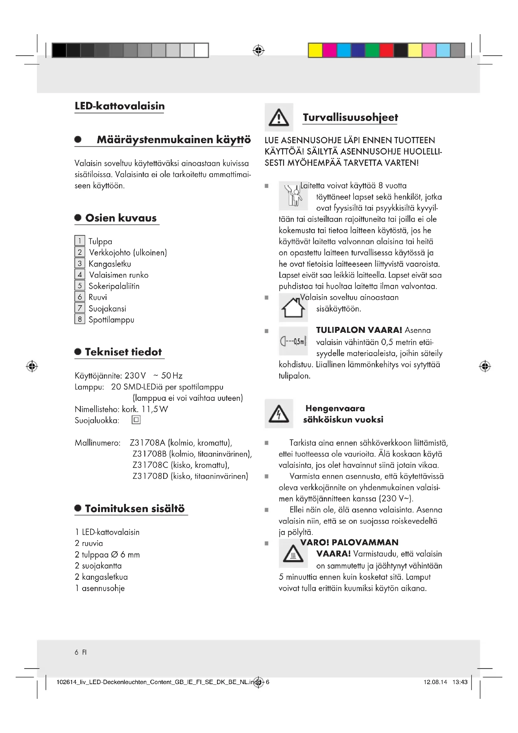 50 Hz Lamppu: 20 SMD-LEDiä per spottilamppu (lamppua ei voi vaihtaa uuteen) Nimellisteho: kork. 11,5 W Suojaluokka: Mallinumero: Z31708A (kolmio, kromattu), Z31708B (kolmio, titaaninvärinen), Z31708C (kisko, kromattu), Z31708D (kisko, titaaninvärinen) Toimituksen sisältö 1 LED-kattovalaisin 2 ruuvia 2 tulppaa Ø 6 mm 2 suojakantta 2 kangasletkua 1 asennusohje Turvallisuusohjeet