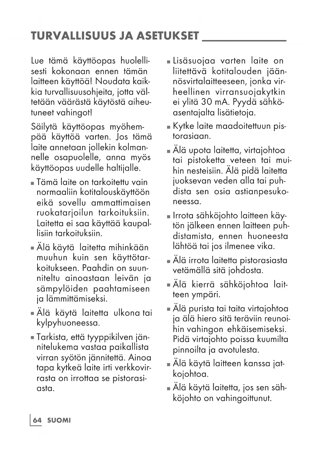 Lisäsuojaa varten laite on liitettävä kotitalouden jään- nösvirtalaitteeseen, jonka vir- heellinen virransuojakytkin ei ylitä 30 mA. Pyydä sähkö- asentajalta lisätietoja.