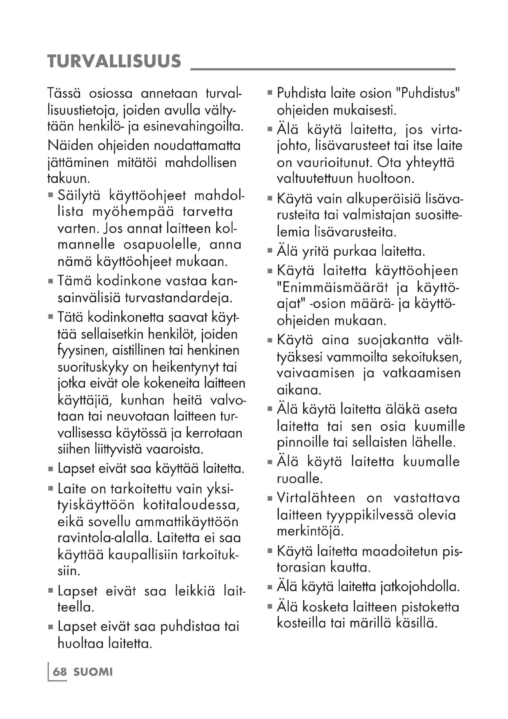 Älä kosketa laitteen pistoketta kosteilla tai märillä käsillä. TURVALLISUUS ____________________________SUOMI 69