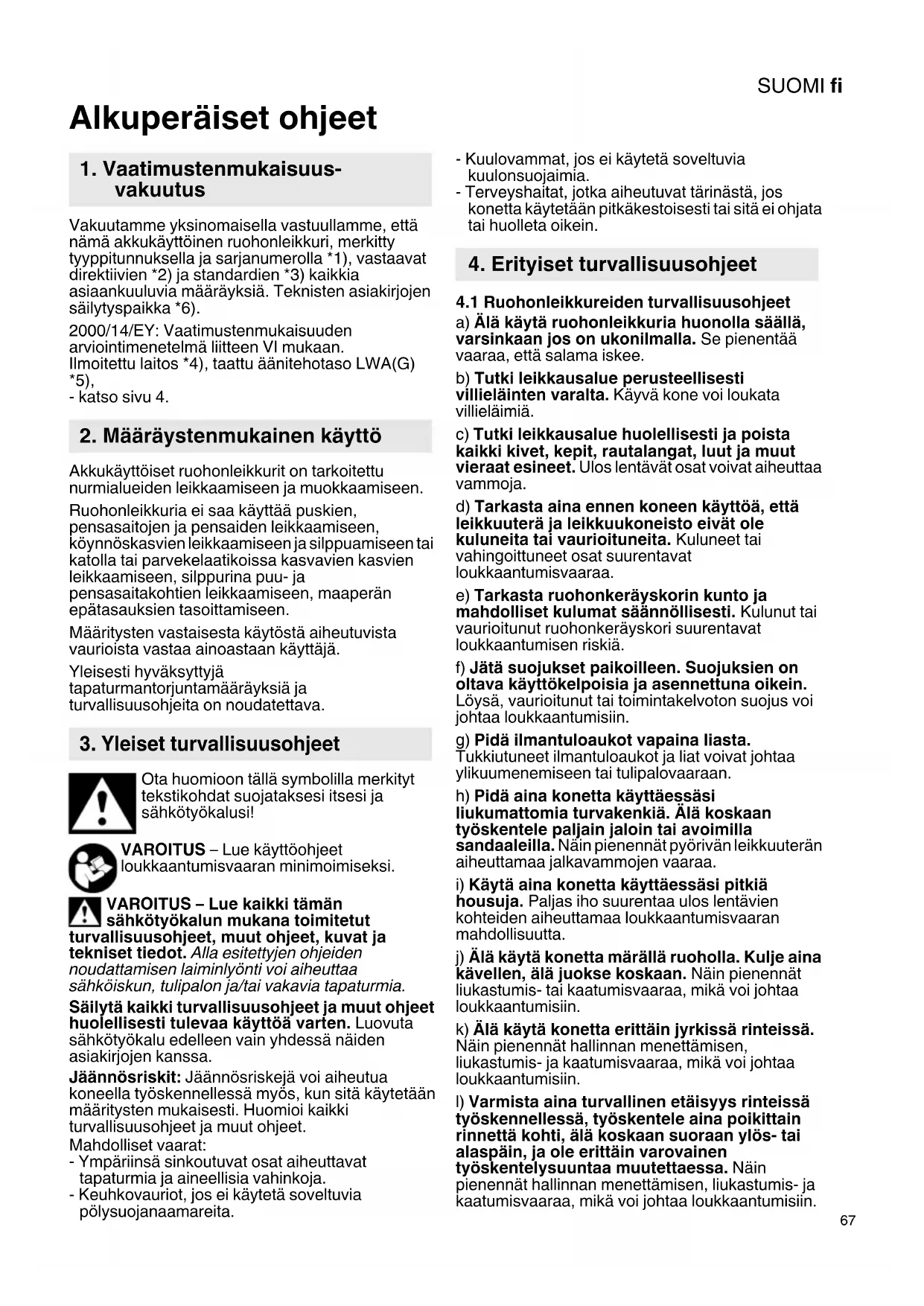 Alkuperäiset ohjeet Vakuutamme yksinomaisella vastuullamme, että nämä akkukäyttöinen ruohonleikkuri, merkitty tyyppitunnuksella ja sarjanumerolla *1), vastaavat direktiivien *2) ja standardien *3) kaikkia asiaankuuluvia määräyksiä. Teknisten asiakirjojen säilytyspaikka *6). 2000/14/EY: Vaatimustenmukaisuuden arviointimenetelmä liitteen VI mukaan. Ilmoitettu laitos *4), taattu äänitehotaso LWA(G) *5), - katso sivu 4. Akkukäyttöiset ruohonleikkurit on tarkoitettu nurmialueiden leikkaamiseen ja muokkaamiseen. Ruohonleikkuria ei saa käyttää puskien, pensasaitojen ja pensaiden leikkaamiseen, köynnöskasvien leikkaamiseen ja silppuamiseen tai katolla tai parvekelaatikoissa kasvavien kasvien leikkaamiseen, silppurina puu- ja pensasaitakohtien leikkaamiseen, maaperän epätasauksien tasoittamiseen. Määritysten vastaisesta käytöstä aiheutuvista vaurioista vastaa ainoastaan käyttäjä. Yleisesti hyväksyttyjä tapaturmantorjuntamääräyksiä ja turvallisuusohjeita on noudatettava. Ota huomioon tällä symbolilla merkityt tekstikohdat suojataksesi itsesi ja sähkötyökalusi! VAROITUS – Lue käyttöohjeet loukkaantumisvaaran minimoimiseksi. VAROITUS – Lue kaikki tämän sähkötyökalun mukana toimitetut turvallisuusohjeet, muut ohjeet, kuvat ja tekniset tiedot. Alla esitettyjen ohjeiden noudattamisen laiminlyönti voi aiheuttaa sähköiskun, tulipalon ja/tai vakavia tapaturmia. Säilytä kaikki turvallisuusohjeet ja muut ohjeet huolellisesti tulevaa käyttöä varten. Luovuta sähkötyökalu edelleen vain yhdessä näiden asiakirjojen kanssa. Jäännösriskit: Jäännösriskejä voi aiheutua koneella työskennellessä myös, kun sitä käytetään määritysten mukaisesti. Huomioi kaikki turvallisuusohjeet ja muut ohjeet. Mahdolliset vaarat: - Ympäriinsä sinkoutuvat osat aiheuttavat tapaturmia ja aineellisia vahinkoja. - Keuhkovauriot, jos ei käytetä soveltuvia pölysuojanaamareita. - Kuulovammat, jos ei käytetä soveltuvia kuulonsuojaimia. - Terveyshaitat, jotka aiheutuvat tärinästä, jos konetta käytetään pitkäkestoisesti tai sitä ei ohjata tai huolleta oikein.