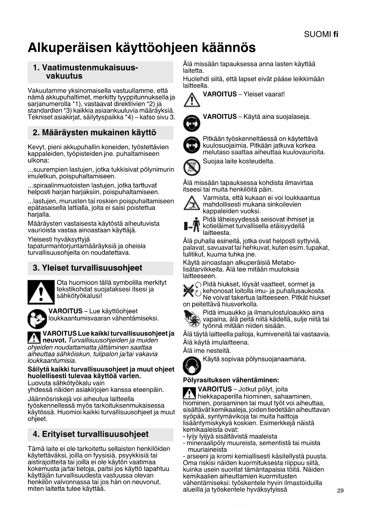Alkuperäisen käyttöohjeen käännös Vakuutamme yksinomaisella vastuullamme, että nämä akkupuhaltimet, merkitty tyyppitunnuksella ja sarjanumerolla *1), vastaavat direktiivien *2) ja standardien *3) kaikkia asiaankuuluvia määräyksiä. Tekniset asiakirjat, säilytyspaikka *4) – katso sivu 3. Kevyt, pieni akkupuhallin koneiden, työstettävien kappaleiden, työpisteiden jne. puhaltamiseen ulkona: ...suurempien lastujen, jotka tukkisivat pölynimurin imuletkun, poispuhaltamiseen. ...spiraalinmuotoisten lastujen, jotka tarttuvat helposti harjan harjaksiin, poispuhaltamiseen. ...lastujen, murusten tai roskien poispuhaltamiseen epätasaisella lattialla, joita ei saisi poistettua harjalla. Määräysten vastaisesta käytöstä aiheutuvista vaurioista vastaa ainoastaan käyttäjä. Yleisesti hyväksyttyjä tapaturmantorjuntamääräyksiä ja oheisia turvallisuusohjeita on noudatettava. Ota huomioon tällä symbolilla merkityt tekstikohdat suojataksesi itsesi ja sähkötyökalusi! VAROITUS – Lue käyttöohjeet loukkaantumisvaaran vähentämiseksi. VAROITUS Lue kaikki turvallisuusohjeet ja neuvot. Turvallisuusohjeiden ja muiden ohjeiden noudattamatta jättäminen saattaa aiheuttaa sähköiskun, tulipalon ja/tai vakavia loukkaantumisia. Säilytä kaikki turvallisuusohjeet ja muut ohjeet huolellisesti tulevaa käyttöä varten. Luovuta sähkötyökalu vain yhdessä näiden asiakirjojen kanssa eteenpäin. Jäännösriskejä voi aiheutua laitteella työskennellessä myös tarkoituksenmukaisessa käytössä. Huomioi kaikki turvallisuusohjeet ja muut ohjeet. Tämä laite ei ole tarkoitettu sellaisten henkilöiden käytettäväksi, joilla on fyysisiä, psyykkisiä tai aistirajoitteita tai joilla ei ole käytön vaatimaa kokemusta ja/tai tietoja, paitsi jos käyttö tapahtuu käyttäjän turvallisuudesta vastuussa olevan henkilön valvonnassa tai jos hän on neuvonut, miten laitetta tulee käyttää. Älä missään tapauksessa anna lasten käyttää laitetta. Huolehdi siitä, että lapset eivät pääse leikkimään laitteella. VAROITUS – Yleiset vaarat! VAROITUS – Käytä aina suojalaseja. Pitkään työskenneltäessä on käytettävä kuulosuojaimia. Pitkään jatkuva korkea melutaso saattaa aiheuttaa kuulovaurioita. Suojaa laite kosteudelta. Älä missään tapauksessa kohdista ilmavirtaa itseesi tai muita henkilöitä päin. Varmista, että kukaan ei voi loukkaantua mahdollisesti mukana sinkoilevien kappaleiden vuoksi. Pidä läheisyydessä seisovat ihmiset ja kotieläimet turvallisella etäisyydellä laitteesta. Älä puhalla esineitä, jotka ovat helposti syttyviä, palavat, savuavat tai hehkuvat, kuten esim. tupakat, tulitikut, kuuma tuhka jne. Käytä ainoastaan alkuperäisiä Metabo- lisätarvikkeita. Älä tee mitään muutoksia laitteeseen. Pidä hiukset, löysät vaatteet, sormet ja kehonosat loitolla imu- ja puhallusaukosta. Ne voivat takertua laitteeseen. Pitkät hiukset on peitettävä hiusverkolla. Pidä imuaukko ja ilmanulostuloaukko aina vapaina, älä peitä niitä kädellä, sulje niitä tai työnnä mitään niiden sisään. Älä täytä laitteella palloja, kumiveneitä tai vastaavia. Älä käytä imulaitteena. Älä ime nesteitä. Käytä sopivaa pölynsuojanaamaria. Pölyrasituksen vähentäminen: VAROITUS – Jotkut pölyt, joita hiekkapaperilla hiominen, sahaaminen, hiominen, poraaminen tai muut työt voi aiheuttaa, sisältävät kemikaaleja, joiden tiedetään aiheuttavan syöpää, syntymävikoja tai muita haittoja lisääntymiskykyä koskien. Esimerkkejä näistä kemikaaleista ovat: - lyijy lyijyä sisältävistä maaleista - mineraalipöly muureista, sementistä tai muista muuriaineista - arseeni ja kromi kemiallisesti käsitellystä puusta. Oma riskisi näiden kuormituksesta riippuu siitä, kuinka usein suoritat tämäntapaisia töitä. Näiden kemikaalien aiheuttamien kuormitusten vähentämiseksi: työskentele hyvin ilmastoiduilla alueilla ja työskentele hyväksytyissä