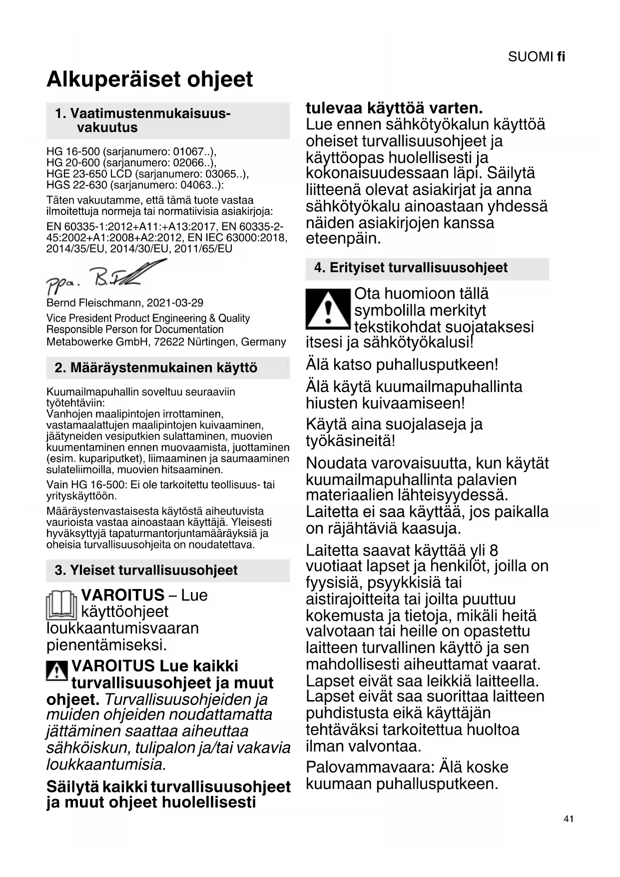 Alkuperäiset ohjeet HG 16-500 (sarjanumero: 01067..), HG 20-600 (sarjanumero: 02066..), HGE 23-650 LCD (sarjanumero: 03065..), HGS 22-630 (sarjanumero: 04063..): Täten vakuutamme, että tämä tuote vastaa ilmoitettuja normeja tai normatiivisia asiakirjoja: EN 60335-1:2012+A11:+A13:2017, EN 60335-2- 45:2002+A1:2008+A2:2012, EN IEC 63000:2018, 2014/35/EU, 2014/30/EU, 2011/65/EU Bernd Fleischmann, 2021-03-29 Vice President Product Engineering & Quality Responsible Person for Documentation Metabowerke GmbH, 72622 Nürtingen, Germany Kuumailmapuhallin soveltuu seuraaviin työtehtäviin: Vanhojen maalipintojen irrottaminen, vastamaalattujen maalipintojen kuivaaminen, jäätyneiden vesiputkien sulattaminen, muovien kuumentaminen ennen muovaamista, juottaminen (esim. kupariputket), liimaaminen ja saumaaminen sulateliimoilla, muovien hitsaaminen. Vain HG 16-500: Ei ole tarkoitettu teollisuus- tai yrityskäyttöön. Määräystenvastaisesta käytöstä aiheutuvista vaurioista vastaa ainoastaan käyttäjä. Yleisesti hyväksyttyjä tapaturmantorjuntamääräyksiä ja oheisia turvallisuusohjeita on noudatettava. VAROITUS – Lue käyttöohjeet loukkaantumisvaaran pienentämiseksi. VAROITUS Lue kaikki turvallisuusohjeet ja muut ohjeet. Turvallisuusohjeiden ja muiden ohjeiden noudattamatta jättäminen saattaa aiheuttaa sähköiskun, tulipalon ja/tai vakavia loukkaantumisia. Säilytä kaikki turvallisuusohjeet ja muut ohjeet huolellisesti tulevaa käyttöä varten. Lue ennen sähkötyökalun käyttöä oheiset turvallisuusohjeet ja käyttöopas huolellisesti ja kokonaisuudessaan läpi. Säilytä liitteenä olevat asiakirjat ja anna sähkötyökalu ainoastaan yhdessä näiden asiakirjojen kanssa eteenpäin. Ota huomioon tällä symbolilla merkityt tekstikohdat suojataksesi itsesi ja sähkötyökalusi! Älä katso puhallusputkeen! Älä käytä kuumailmapuhallinta hiusten kuivaamiseen! Käytä aina suojalaseja ja työkäsineitä! Noudata varovaisuutta, kun käytät kuumailmapuhallinta palavien materiaalien lähteisyydessä. Laitetta ei saa käyttää, jos paikalla on räjähtäviä kaasuja. Laitetta saavat käyttää yli 8 vuotiaat lapset ja henkilöt, joilla on fyysisiä, psyykkisiä tai aistirajoitteita tai joilta puuttuu kokemusta ja tietoja, mikäli heitä valvotaan tai heille on opastettu laitteen turvallinen käyttö ja sen mahdollisesti aiheuttamat vaarat. Lapset eivät saa leikkiä laitteella. Lapset eivät saa suorittaa laitteen puhdistusta eikä käyttäjän tehtäväksi tarkoitettua huoltoa ilman valvontaa. Palovammavaara: Älä koske kuumaan puhallusputkeen.
