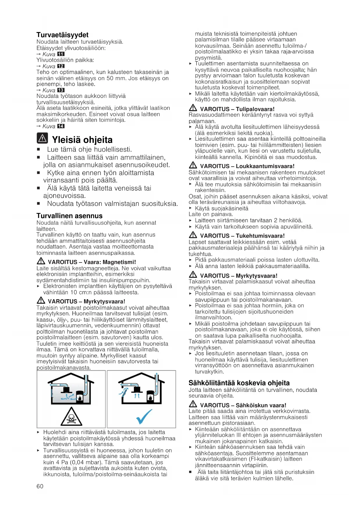 Turvallisuussyistä ei huoneessa, johon tuuletin on asennettu, vallitseva alipaine saa olla korkeampi kuin 4Pa(0,04mbar). Tämä saavutetaan, jos avattavista ja suljettavista aukoista kuten ovista, ikkunoista, tuloilma/poistoilma-seinäaukoista tai muista teknisistä toimenpiteistä johtuen palamisilman tilalle pääsee virtaamaan korvausilmaa. Seinään asennettu tuloilma-/ poistoilmalaatikko ei yksin takaa raja-arvoissa pysymistä.