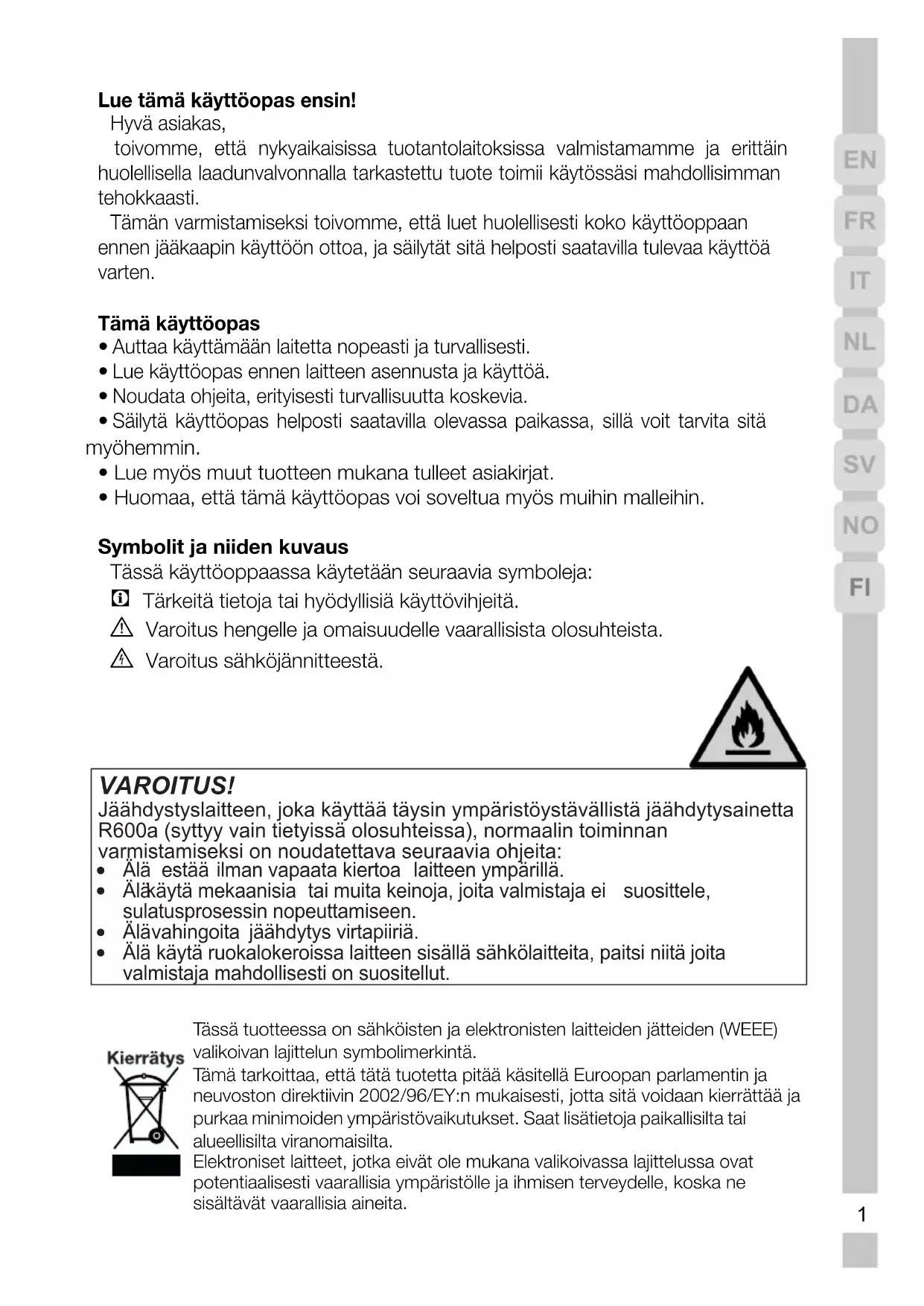 - Huomaa, että tämä käyttöopas voi soveltua myös muihin malleihin. Symbolit ja niiden kuvaus Tässä käyttöoppaassa käytetään seuraavia symboleja: C Tärkeitä tietoja tai hyödyllisiä käyttövihjeitä. A Varoitus hengelle ja omaisuudelle vaarallisista olosuhteista. B Varoitus sähköjännitteestä. Tässä tuotteessa on sähköisten ja elektronisten laitteiden jätteiden (WEEE) valikoivan lajittelun symbolimerkintä. Tämä tarkoittaa, että tätä tuotetta pitää käsitellä Euroopan parlamentin ja neuvoston direktiivin 2002/96/EY:n mukaisesti, jotta sitä voidaan kierrättää ja purkaa minimoiden ympäristövaikutukset. Saat lisätietoja paikallisilta tai alueellisilta viranomaisilta. Elektroniset laitteet, jotka eivät ole mukana valikoivassa lajittelussa ovat potentiaalisesti vaarallisia ympäristölle ja ihmisen terveydelle, koska ne sisältävät vaarallisia aineita. VAROITUS! Jäähdystyslaitteen, joka käyttää täysin ympäristöystävällistä jäähdytysainetta R600a (syttyy vain tietyissä olosuhteissa), normaalin toiminnan varmistamiseksi on noudatettava seuraavia ohjeita: