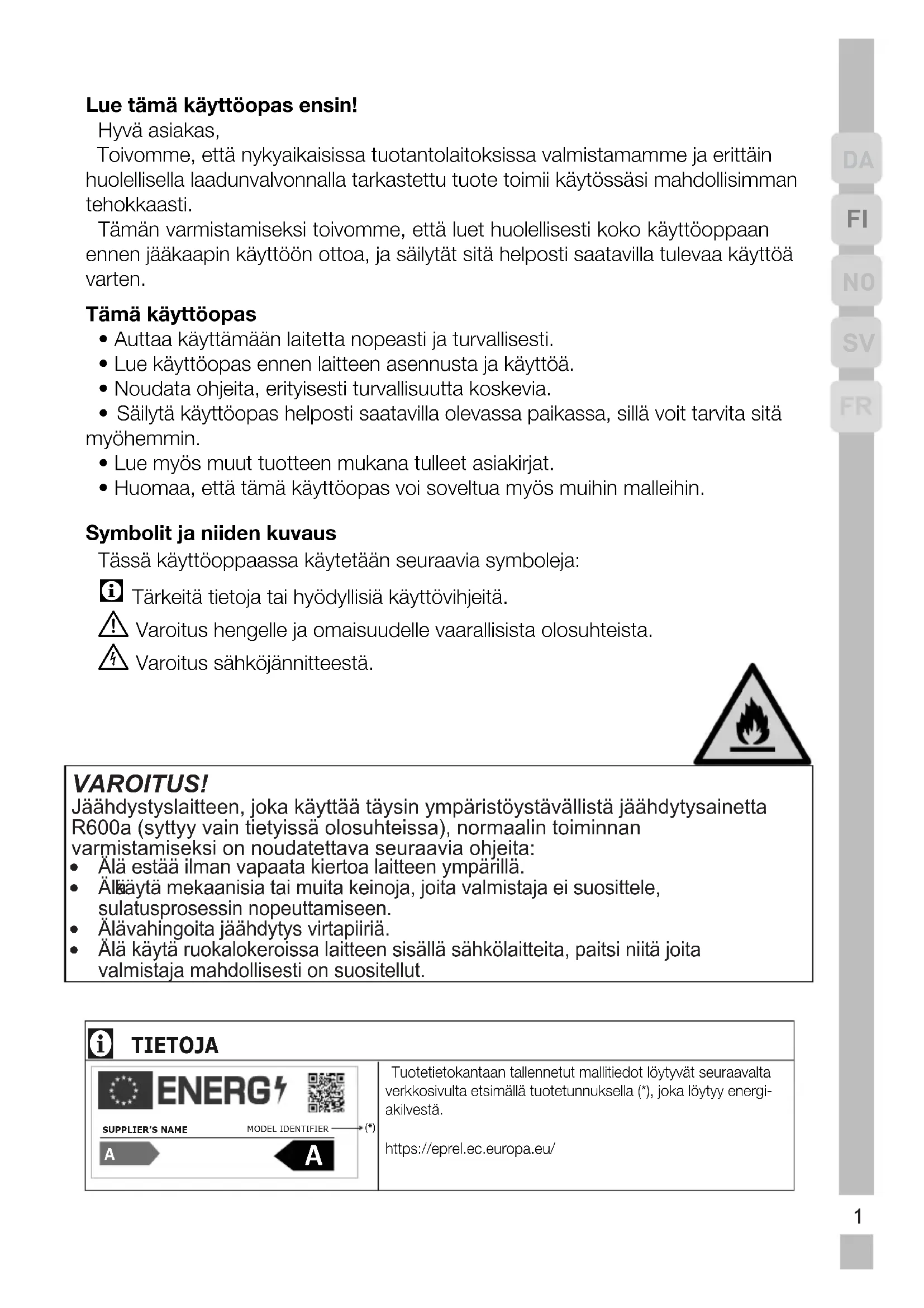 - Maden berører måske skuffens top. Omarranger maden i skuffen. 16FR Lue tämä käyttöopas ensin!Hyvä asiakas, Toivomme, että nykyaikaisissa tuotantolaitoksissa valmistamamme ja erittäin huolellisella laadunvalvonnalla tarkastettu tuote toimii käytössäsi mahdollisimman tehokkaasti. Tämän varmistamiseksi toivomme, että luet huolellisesti koko käyttöoppaan ennen jääkaapin käyttöön ottoa, ja säilytät sitä helposti saatavilla tulevaa käyttöä varten.Tämä käyttöopas• Auttaa käyttämään laitetta nopeasti ja turvallisesti.• Lue käyttöopas ennen laitteen asennusta ja käyttöä.• Noudata ohjeita, erityisesti turvallisuutta koskevia.• Säilytä käyttöopas helposti saatavilla olevassa paikassa, sillä voit tarvita sitämyöhemmin. • Lue myös muut tuotteen mukana tulleet asiakirjat.• Huomaa, että tämä käyttöopas voi soveltua myös muihin malleihin.Symbolit ja niiden kuvausTässä käyttöoppaassa käytetään seuraavia symboleja: C Tärkeitä tietoja tai hyödyllisiä käyttövihjeitä. A Varoitus hengelle ja omaisuudelle vaarallisista olosuhteista. B Varoitus sähköjännitteestä.