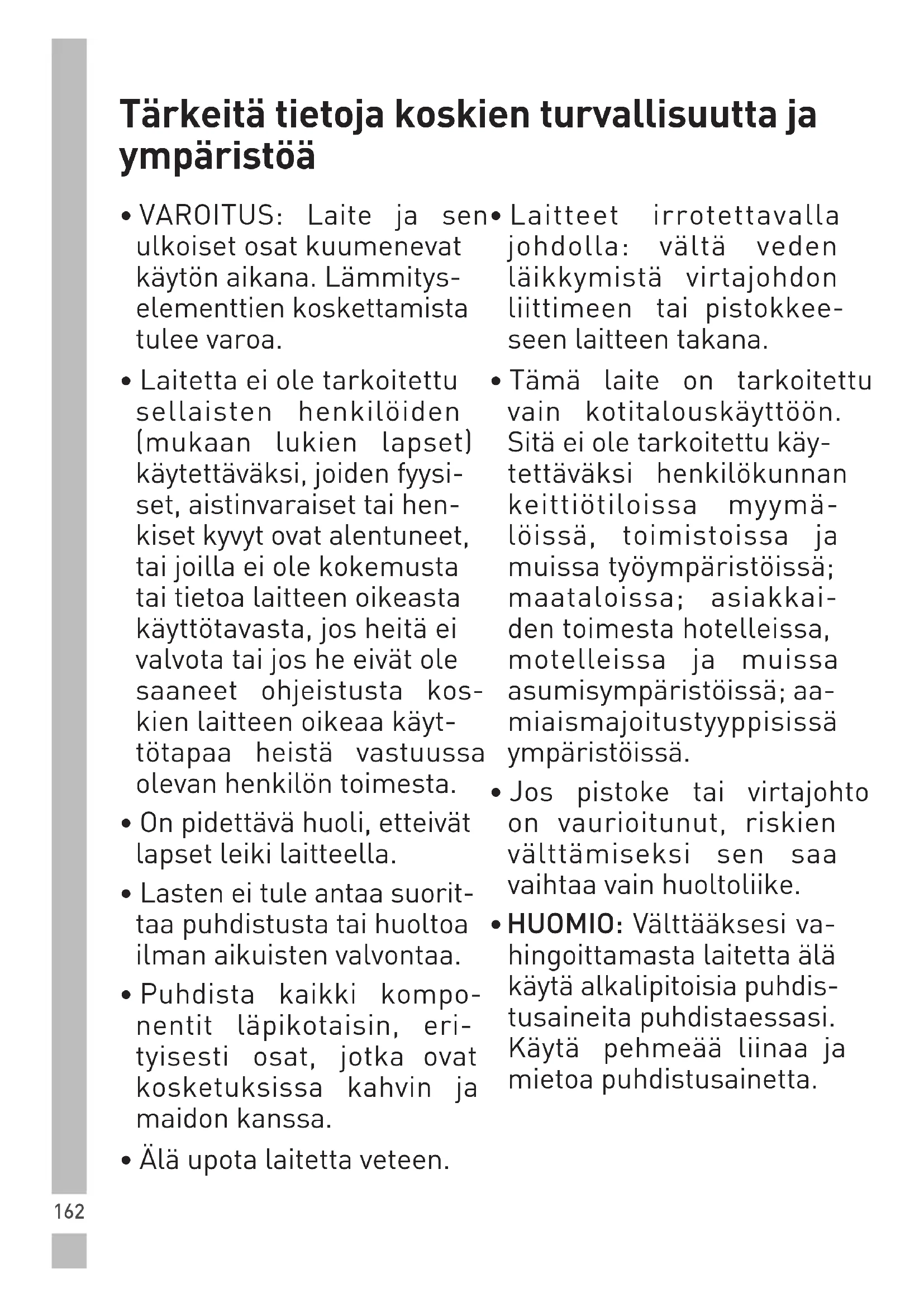 - Jos pistoke tai virtajohto on vaurioitunut, riskien välttämiseksi sen saa vaihtaavainhuoltoliike.