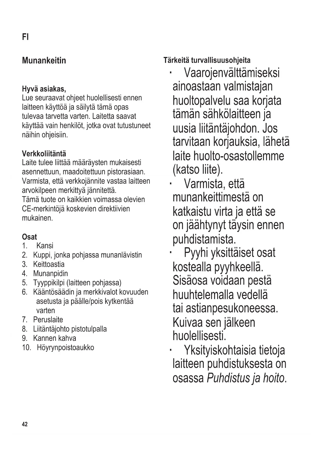 Tärkeitä turvallisuusohjeita ∙ Vaarojen välttämiseksi ainoastaan valmistajan huoltopalvelu saa korjata tämän sähkölaitteen ja uusia liitäntäjohdon. Jos tarvitaan korjauksia, lähetä laite huolto-osastollemme (katso liite). ∙ Varmista, että munankeittimestä on katkaistu virta ja että se on jäähtynyt täysin ennen puhdistamista. ∙ Pyyhi yksittäiset osat kostealla pyyhkeellä. Sisäosa voidaan pestä huuhtelemalla vedellä tai astianpesukoneessa. Kuivaa sen jälkeen huolellisesti. ∙ Yksityiskohtaisia tietoja laitteen puhdistuksesta on osassa Puhdistus ja hoito. FI104 x 142 mm