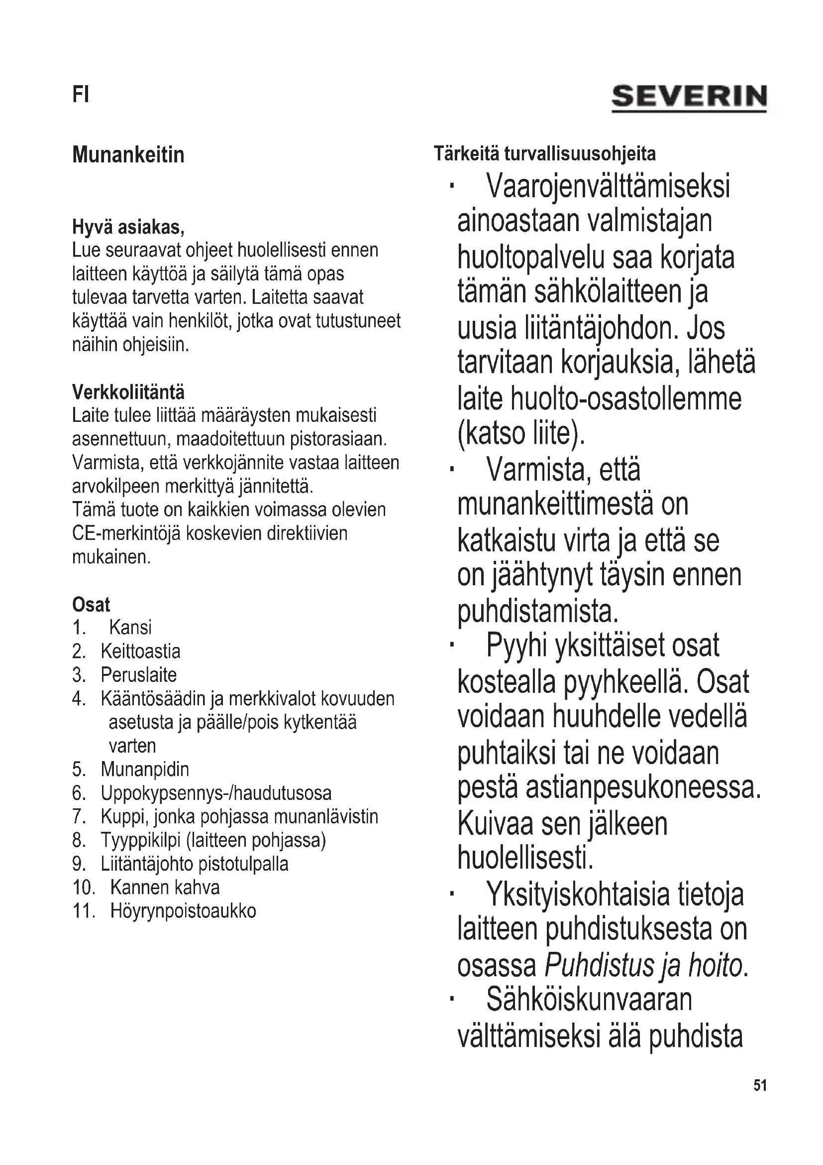 Munankeitin Hyvä asiakas, Lue seuraavat ohjeet huolellisesti ennen laitteen käyttöä ja säilytä tämä opas tulevaa tarvetta varten. Laitetta saavat käyttää vain henkilöt, jotka ovat tutustuneet näihin ohjeisiin. Verkkoliitäntä Laite tulee liittää määräysten mukaisesti asennettuun, maadoitettuun pistorasiaan. Varmista, että verkkojännite vastaa laitteen arvokilpeen merkittyä jännitettä. Tämä tuote on kaikkien voimassa olevien CE-merkintöjä koskevien direktiivien mukainen. Osat