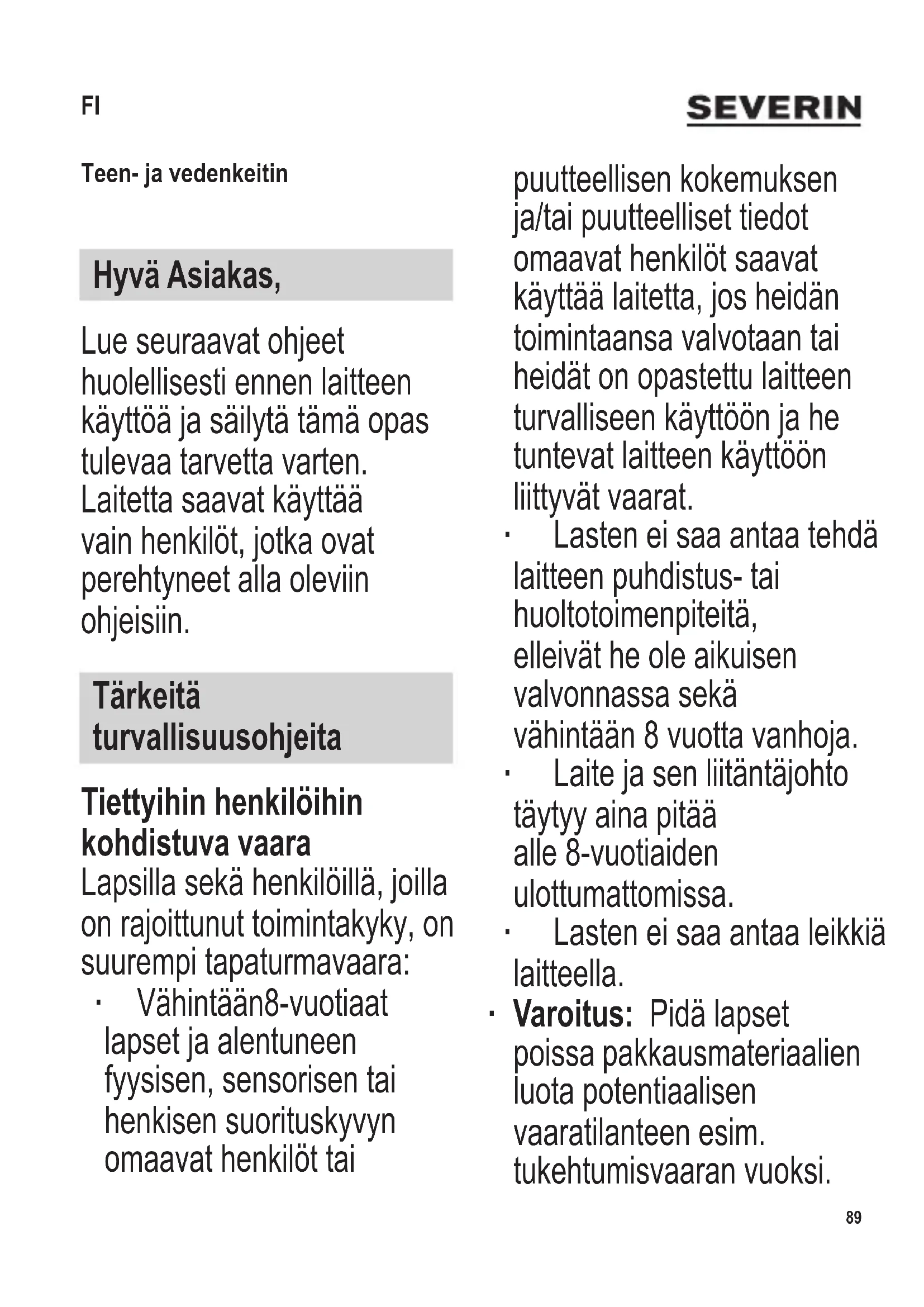 Teen- ja vedenkeitin Hyvä Asiakas, Lue seuraavat ohjeet huolellisesti ennen laitteen käyttöä ja säilytä tämä opas tulevaa tarvetta varten. Laitetta saavat käyttää vain henkilöt, jotka ovat perehtyneet alla oleviin ohjeisiin. Tärkeitä turvallisuusohjeita Tiettyihin henkilöihin kohdistuva vaara Lapsilla sekä henkilöillä, joilla on rajoittunut toimintakyky, on suurempi tapaturmavaara: ∙ Vähintään 8-vuotiaat lapset ja alentuneen fyysisen, sensorisen tai henkisen suorituskyvyn omaavat henkilöt tai puutteellisen kokemuksen ja/tai puutteelliset tiedot omaavat henkilöt saavat käyttää laitetta, jos heidän toimintaansa valvotaan tai heidät on opastettu laitteen turvalliseen käyttöön ja he tuntevat laitteen käyttöön liittyvät vaarat. ∙ Lasten ei saa antaa tehdä laitteen puhdistus- tai huoltotoimenpiteitä, elleivät he ole aikuisen valvonnassa sekä vähintään 8 vuotta vanhoja. ∙ Laite ja sen liitäntäjohto täytyy aina pitää alle 8-vuotiaiden ulottumattomissa. ∙ Lasten ei saa antaa leikkiä laitteella. ∙ Varoitus: Pidä lapset poissa pakkausmateriaalien luota potentiaalisen vaaratilanteen esim. tukehtumisvaaran vuoksi. FI90 104 x 142 mm Sähköiskun vaara Laite on sähköllä toimiva, joten aina on olemassa sähköiskun vaara. Sen vuoksi on ryhdyttävä seuraaviin varotoimiin: ∙ Tarkasta aina ennen laitteen käyttöä huolellisesti laitteen runko, liitäntäjohto ja mahdolliset asennetut lisäosat vaurioiden varalta. Jos laite on esimerkiksi pudonnut kovalle pinnalle tai liitäntäjohdon vetämiseen on käytetty liikaa voimaa, laitetta ei saa enää käyttää: näkymättömätkin vauriot voivat aiheuttaa laitetta käytettäessä vaaratilanteita. ∙ Laite tulee liittää määräysten mukaisesti asennettuun pistorasiaan. Varmista, että verkkojännite vastaa laitteen arvokilpeen merkittyä jännitettä. ∙ Koska keittimen virrankulutus on korkea, sitä ei saa käyttää minkäänlaisten jatkojohtojen kanssa. ∙ Irrota pistotulppa pistorasiasta aina - käytön jälkeen, - jos laitteessa on käyttöhäiriö, - ennen laitteen puhdistamista. ∙ Kun irrotat pistokkeen pistorasiasta, älä vedä liitäntäjohdosta vaan tartu aina pistokkeeseen. ∙ Älä kosketa pistoketta märin käsin. ∙ Varoitus! Alustassa olevat sähköliitännät täytyy aina suojata niin, etteivät niihin pääse vettä. ∙ Älä puhdista kannua ja alustaa nesteillä äläkä upota niitä nesteisiin; älä104 x 142 mm