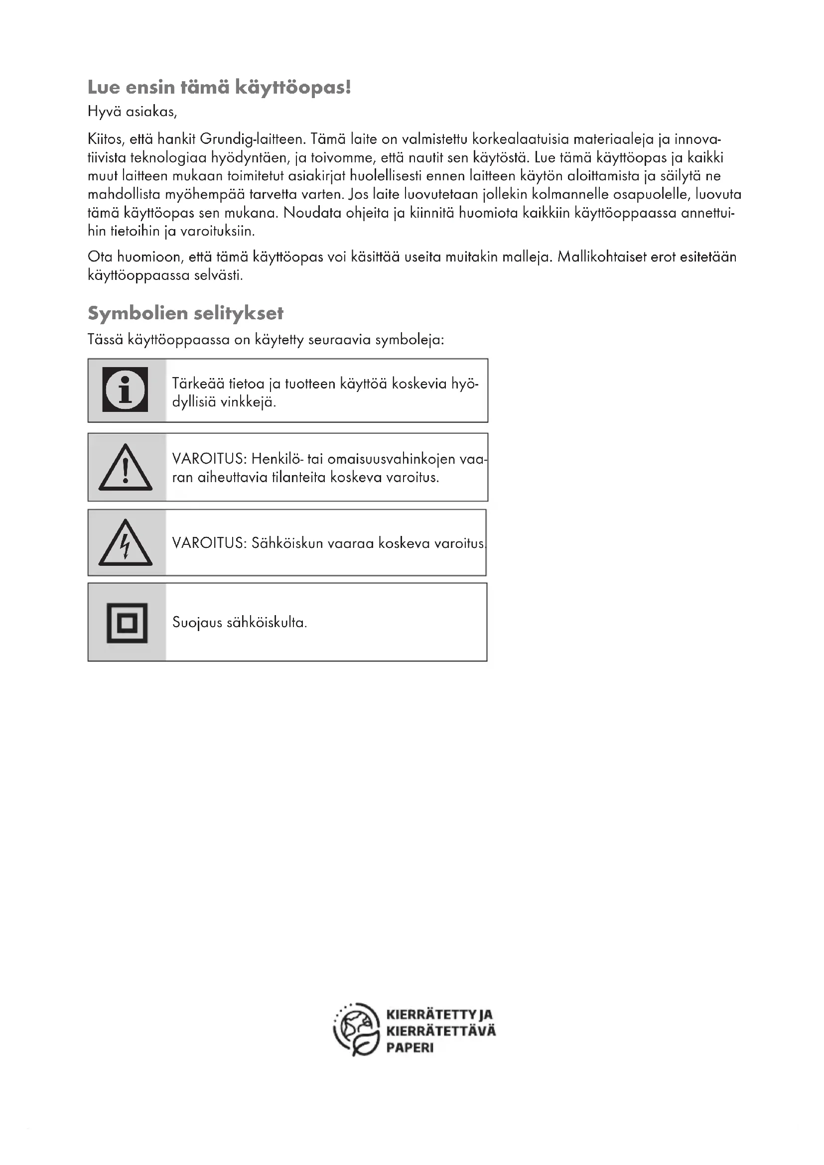 utstyr. Passende avhending av brukt apparat bi- drar til å forhindre potensielle negative konse- kvenser for miljøet og menneskers helse. Samsvar med RoHS-direktivet Produktet du har kjøpt, er i samsvar med EUs Ro- HS-direktiv (2011/65/EU). Det inneholder ikke skadelige eller forbudte materialer som spesifisert i direktivet. Pakningsinformasjon Pakningsmaterialer for produkter er produsert av resirkulerbare materialer i henhold til våre nasjonale miljøfor- skrifter. Ikke kasser pakningsmateriale- ne sammen med husholdningsavfall eller annet avfall. Ta dem med til miljøstasjoner som er opp- rettet av lokale offentlige myndigheter.Lue ensin tämä käyttöopas! Hyvä asiakas, Kiitos, että hankit Grundig-laitteen. Tämä laite on valmistettu korkealaatuisia materiaaleja ja innova- tiivista teknologiaa hyödyntäen, ja toivomme, että nautit sen käytöstä. Lue tämä käyttöopas ja kaikki muut laitteen mukaan toimitetut asiakirjat huolellisesti ennen laitteen käytön aloittamista ja säilytä ne mahdollista myöhempää tarvetta varten. Jos laite luovutetaan jollekin kolmannelle osapuolelle, luovuta tämä käyttöopas sen mukana. Noudata ohjeita ja kiinnitä huomiota kaikkiin käyttöoppaassa annettui- hin tietoihin ja varoituksiin. Ota huomioon, että tämä käyttöopas voi käsittää useita muitakin malleja. Mallikohtaiset erot esitetään käyttöoppaassa selvästi. Symbolien selitykset Tässä käyttöoppaassa on käytetty seuraavia symboleja: