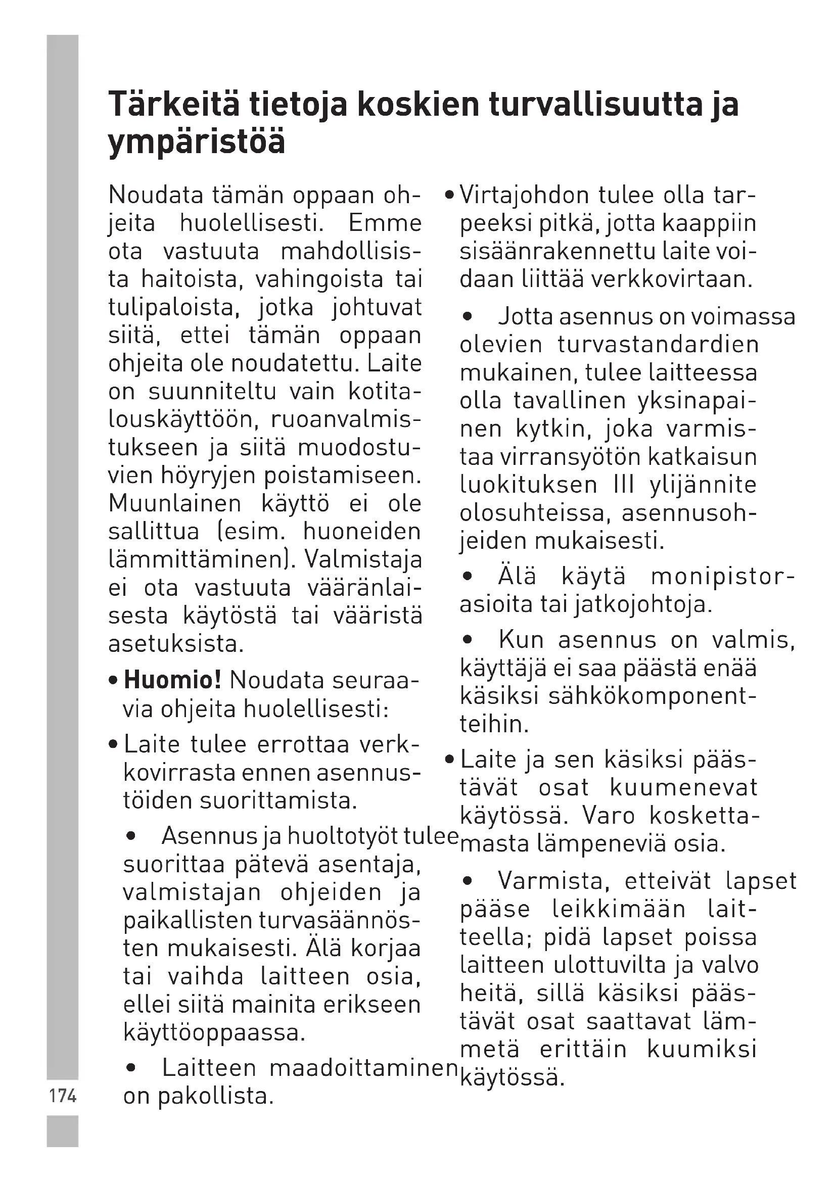 - Lapset eivät saa koskaan puhdistaa tai tehdä käyt- täjän huoltotoimia, jollei heitä valvota asianmukai- sesti. Tärkeitä tietoja koskien turvallisuutta ja ympäristöä