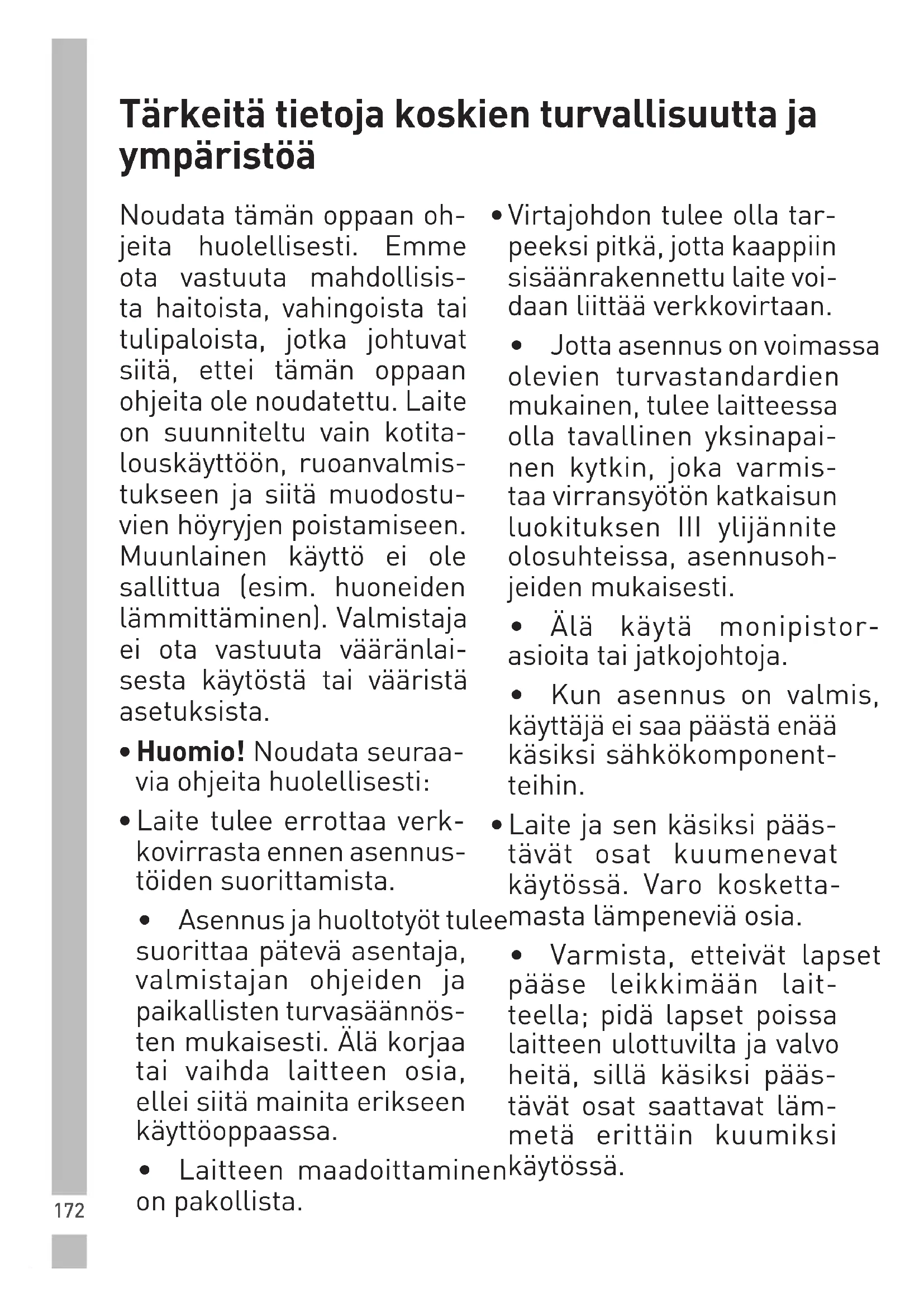 FR172 Tärkeitä tietoja koskien turvallisuutta ja ympäristöä Noudata tämän oppaan oh- jeita huolellisesti. Emme ota vastuuta mahdollisis- ta haitoista, vahingoista tai tulipaloista, jotka johtuvat siitä, ettei tämän oppaan ohjeita ole noudatettu. Laite on suunniteltu vain kotita- louskäyttöön, ruoanvalmis- tukseen ja siitä muodostu- vien höyryjen poistamiseen. Muunlainen käyttö ei ole sallittua (esim. huoneiden lämmittäminen). Valmistaja ei ota vastuuta vääränlai- sesta käytöstä tai vääristä asetuksista.
