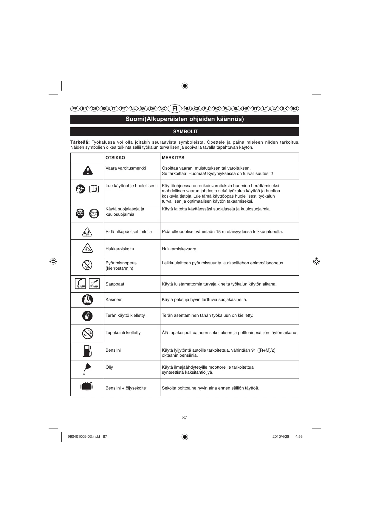 Suomi(Alkuperäisten ohjeiden käännös) SYMBOLIT Tärkeää: Työkalussa voi olla joitakin seuraavista symboleista. Opettele ja paina mieleen niiden tarkoitus. Näiden symbolien oikea tulkinta sallii työkalun turvallisen ja sopivalla tavalla tapahtuvan käytön. OTSIKKO MERKITYS Vaara varoitusmerkki Osoittaa vaaran, muistutuksen tai varoituksen. Se tarkoittaa: Huomaa! Kysymyksessä on turvallisuutesi!!! Lue käyttöohje huolellisesti Käyttöohjeessa on erikoisvaroituksia huomion herättämiseksi mahdollisen vaaran johdosta sekä työkalun käyttöä ja huoltoa koskevia tietoja. Lue tämä käyttöopas huolellisesti työkalun turvallisen ja optimaalisen käytön takaamiseksi. Käytä suojalaseja ja kuulosuojaimia Käytä laitetta käyttäessäsi suojalaseja ja kuulosuojaimia. Pidä ulkopuoliset loitolla Pidä ulkopuoliset vähintään 15 m etäisyydessä leikkuualueelta. Hukkaroiskeita Hukkaroiskevaara. Pyörimisnopeus (kierrosta/min) Leikkuulaitteen pyörimissuunta ja akselitehon enimmäisnopeus. Saappaat Käytä luistamattomia turvajalkineita työkalun käytön aikana. Käsineet Käytä paksuja hyvin tarttuvia suojakäsineitä. Terän käyttö kielletty Terän asentaminen tähän työkaluun on kielletty. Tupakointi kielletty Älä tupakoi polttoaineen sekoituksen ja polttoainesäiliön täytön aikana. Bensiini Käytä lyijytöntä autoille tarkoitettua, vähintään 91 ([R+M]/2) oktaanin bensiiniä. Öljy Käytä ilmajäähdytetyille moottoreille tarkoitettua synteettistä kaksitahtiöljyä. Bensiini + öljysekoite Sekoita polttoaine hyvin aina ennen säiliön täyttöä.