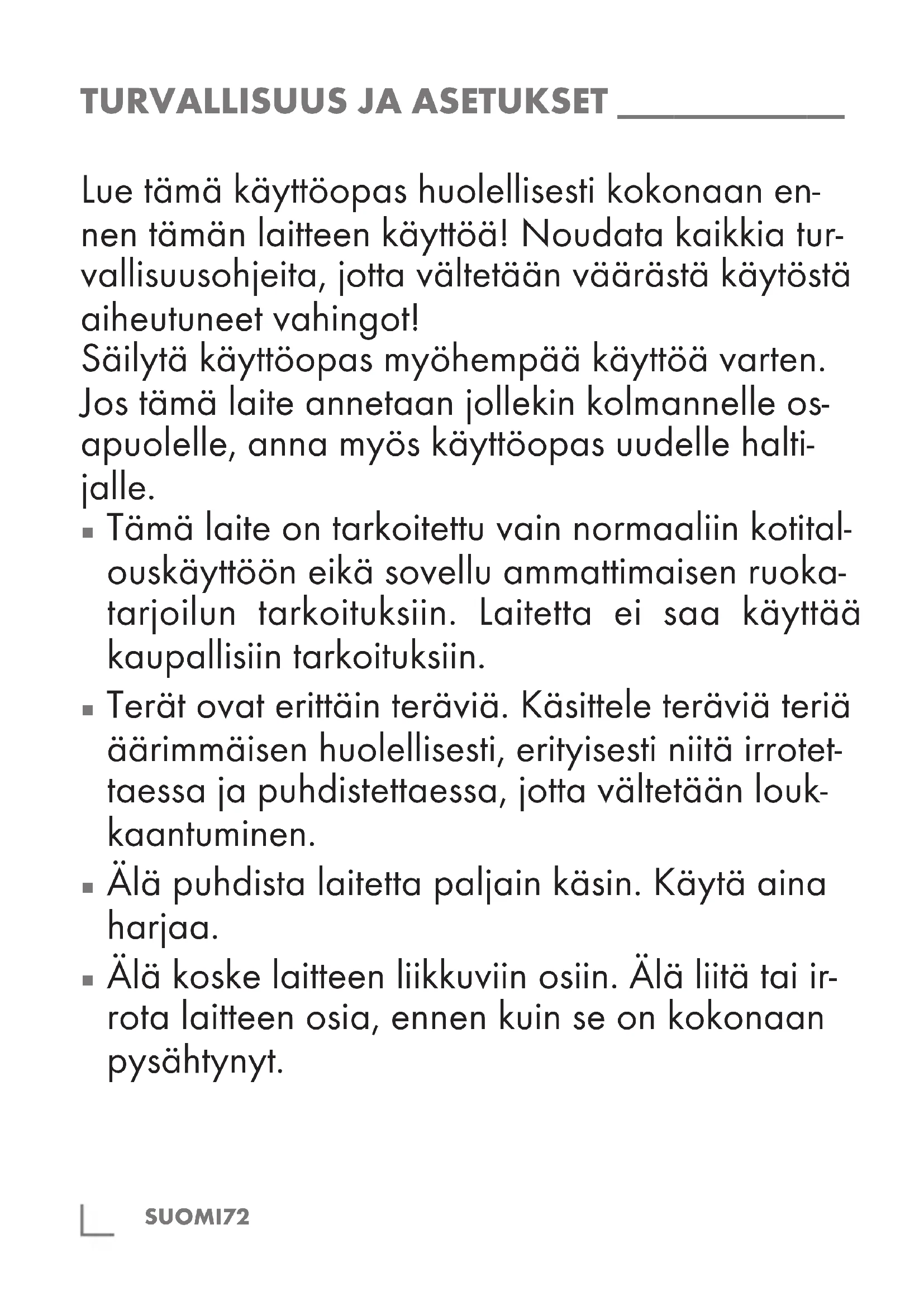 Älä koske laitteen liikkuviin osiin. Älä liitä tai ir- rota laitteen osia, ennen kuin se on kokonaan pysähtynyt.SUOMI
