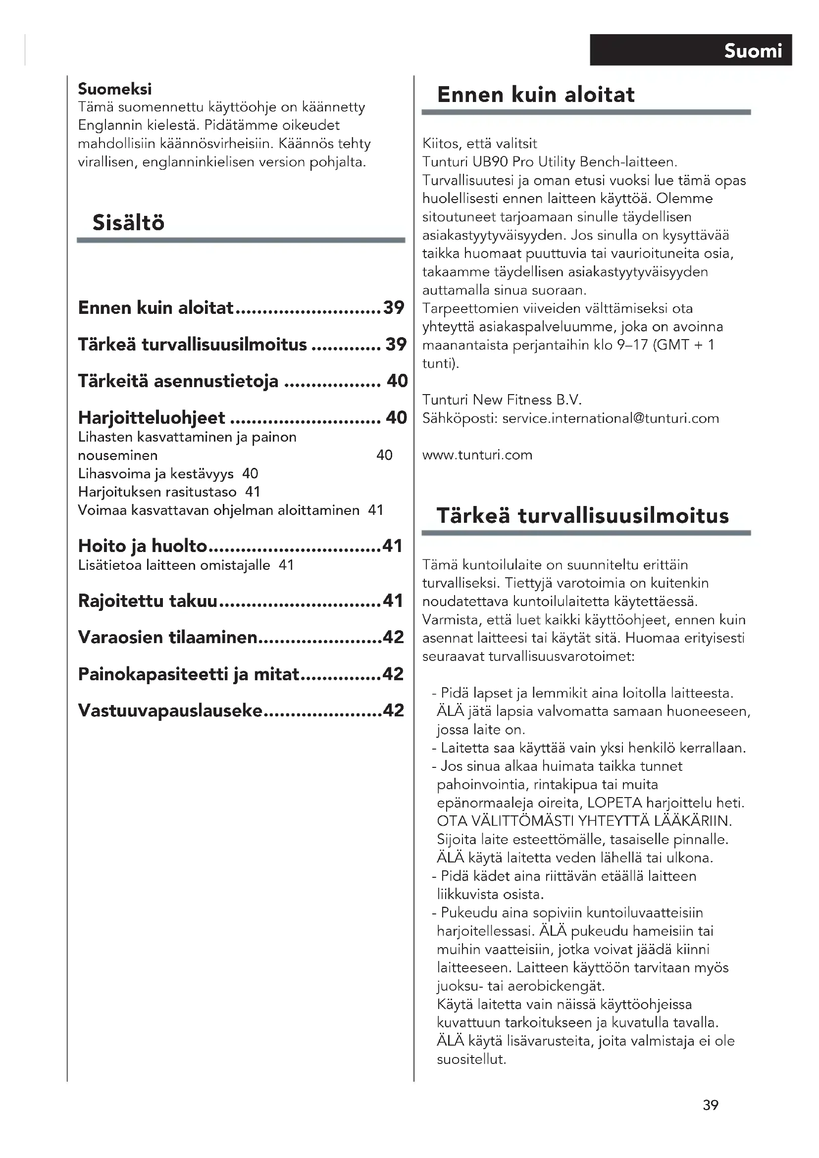 - Varmista, että kaikki kääntyvät osat pääsevät liikkumaan vapaasti. Harjoitteluohjeet Lihasten kasvattaminen ja painon nouseminen Toisin kuin aerobisessa harjoittelussa, jossa korostetaan kestävyysharjoittelua, anaerobisessa harjoittelussa keskitytään voimaharjoitteluun. Paino voi nousta asteittain, kun lihasten kokoa ja voimaa kasvatetaan. Lihasmassaa kehitettäessä kehosi mukautuu siihen kohdistuvaan rasitukseen. Voit muokata ruokavaliotasi niin, että siihen sisältyy esimerkiksi lihaa, kalaa ja vihanneksia. Nämä ruoka-aineet auttavat lihaksia palautumaan ja täydentävät tärkeiden ravintoaineiden määrää rasittavan harjoittelun jälkeen. Lihasvoima ja kestävyys Jotta harjoittelusta saa suurimman mahdollisen hyödyn, on tärkeää laatia kuntoiluohjelma, jonka ansiosta saat harjoitettua kaikkia tärkeitä lihasryhmiä tasapuolisesti. Jos haluat lisätä lihasvoimaa, noudata tätä periaatetta: Lihasvoima lisääntyy, kun vastusta lisätään ja harjoituksen toistomäärä pidetään samana. Jos haluat kiinteyttää vartaloasi, noudata tätä periaatetta: Vartalo kiinteytyy, kun vastusta vähennetään ja harjoituksen toistomäärää lisätään. Kun harjoitus tuntuu helpolta, voit muuttaa vastusta, toistomäärää tai nopeutta, jolla teet harjoituksen. Kaikkia kolmea muuttujaa ei ole tarpeen muuttaa. Voit esimerkiksi harjoitella 10 kg:n painolla ja tehdä harjoituksen 10 kertaa 3 minuutissa. Kun tästä tulee liian helppoa, voit päättää nostaa painoksi 12 kg ja tehdä saman toistomäärän samassa ajassa. Lihasvoima kehittyy useimmiten nostamalla suurempia painoja vähempiä kertoja. Jos haluat kehittää sekä lihasvoimaa että kestävyyttä, suositeltavaa on, että teet jokaisessa harjoituksessa 15–20 toistoa sarjaa kohden. Harjoituksen rasitustaso Se, miten kovaa alat harjoitella, riippuu yleisestä kuntotasostasi. Kokemaasi kipua voi pienentää vähentämällä lihaksiisi kohdistuvaa kuormaa ja tehtyjen sarjojen määrää.41 Suomi Vammojen välttämiseksi sinun pitäisi täydentää kuntoiluohjelmaa asteittain ja määrittää kuormitus yksilöllisen kuntotasosi mukaan. Kuormituksen pitäisi kasvaa kuntosi kasvaessa. Lihaskipu on yleistä, erityisesti aloittaessasi harjoittelun. Jos kipu tuntuu pahalta ja kestää pitkään, sinun on ehkä muutettava ohjelmaa. Lopulta lihaksistosi tottuu siihen kohdistuvaan rasitukseen ja kuormaan. Voimaa kasvattavan ohjelman aloit- taminen Alkuverryttely Voimaharjoittelun aluksi on tärkeää venytellä ja harjoitella kevyesti 5–10 minuutin ajan. Tämä auttaa kehoa valmistautumaan rasittavampaan harjoitteluun lisäämällä verenkiertoa, nostamalla ruumiinlämpöä ja tuomalla lisää happea lihaksiin. Harjoittelu Kaikessa harjoittelussa on muistettava, että pitkään kestävä lihaskipu ei ole toivottavaa ja voi kertoa vamman syntymisestä. Loppuverryttely Venyttele jokaisen harjoittelukerran lopussa hitaasti 5–10 minuutin ajan. Tee kaikki venytykset asteittain menemällä vain niin pitkälle kuin pystyt. Tämä vaihe auttaa lihaksiasi palautumaan harjoittelun jälkeen. Jotta kuntoiluohjelma on kokonaisvaltainen, on suositeltavaa, että voimaharjoittelun lisäksi siinä on 2–3 päivänä aerobista harjoittelua. Veden juominen Keho voi toimia asianmukaisesti vain, jos sitä nesteytetään oikein. Jos kuntoilet, nautittavien nesteiden määrää on lisättävä. Tähän on syynä se, että nauttimasi vesi poistuu elimistöstäsi hikoilun kautta, joka viilentää kehoasi harjoittelun aikana. Harjoittelun aikana menettämäsi vesi on korvattava, jotta lihakset palautuvat kunnolla. Lepopäivä Vaikka et sitä haluaisikaan, on tärkeää pitää lepopäivä vähintään kerran viikossa, jotta kehosi saa mahdollisuuden toipua. Lihasten jatkuva harjoittaminen johtaa yliharjoitteluun, joka ei ole hyödyksi pitkällä aikavälillä. Hoito ja huolto - Voitele liikkuvat osat säännöllisesti WD-40:llä tai kevyellä öljyllä. - Tarkasta ja kiristä kaikki osat ennen laitteen käyttöä. - Laitteen voi puhdistaa kevyesti kostutetulla liinalla ja miedolla, hankaamattomalla puhdistusaineella. ÄLÄ KÄYTÄ liuottimia. - Tarkasta säännöllisesti, että laite ei ole vahingoittunut tai kulunut. - Vaihda vialliset osat välittömästi ja/tai pidä laite poissa käytöstä siihen asti kun se on korjattu. - Tarkastuksen laiminlyönti voi vaikuttaa laitteen turvallisuuteen. Lisätietoa laitteen omistajalle Pakkauksen hävittäminen Lainsäädäntö ohjeistaa meitä vähentämään kaatopaikoille toimitetun jätteen määrää. Sen vuoksi pyydämme sinua toimittamaan kaikki pakkausjätteet sitä varten tarkoitettuun kierrät Laitteen hävittäminen käyttoiän päättyessä Me Tunturilla toivomme, että iloitset kuntolaitteestasi vuosia. Jokainen kuntolaite tulee kuitenkin aikanaan oman käyttöikänsä loppuun. Kotitalouksien sähkö- ja elektroniikkalaiteromua käsittelevien eurooppalaisten määräysten (WEEE) mukaan sinun kuuluu toimittaa kuntolaitteesi sitä varten tarkoitettuun keräyspaikkaan. Rajoitettu takuu Tunturi New Fitness takaa, että tuotteessa ei esiinny valmistus- tai materiaalivikoja, kun sitä käytetään ja huolletaan normaalisti, rungon osalta kahteen vuoteen sekä kaikkien muiden osien osalta yhteen vuoteen ostopäivästä lukien. Tämä takuu koskee vain laitteen alkuperäisostajaa. Tunturi New Fitnessin tämän takuun mukainen velvollisuus rajoittuu vaurioituneiden tai viallisten osien vaihtamiseen Tunturi New Fitnessin valinnan mukaan. Kaikkiin palautuksiin on hankittava ennakolta Tunturi New Fitnessin lupa. Tämä takuu ei kata mitään tuotetta tai tuotevauriota, jonka on aiheuttanut rahtivahinko, väärinkäyttö, virheellinen42 Suomi käyttö, epäasianmukainen tai epätavallinen käyttö, ostajan oma korjaus tai tuote, jota on käytetty kaupallisissa tai vuokraustarkoituksissa, taikka joka johtuu sellaisesta. Tunturi New Fitness ei myönnä mitään muuta takuuta kuin nimenomaisesti edellä esit