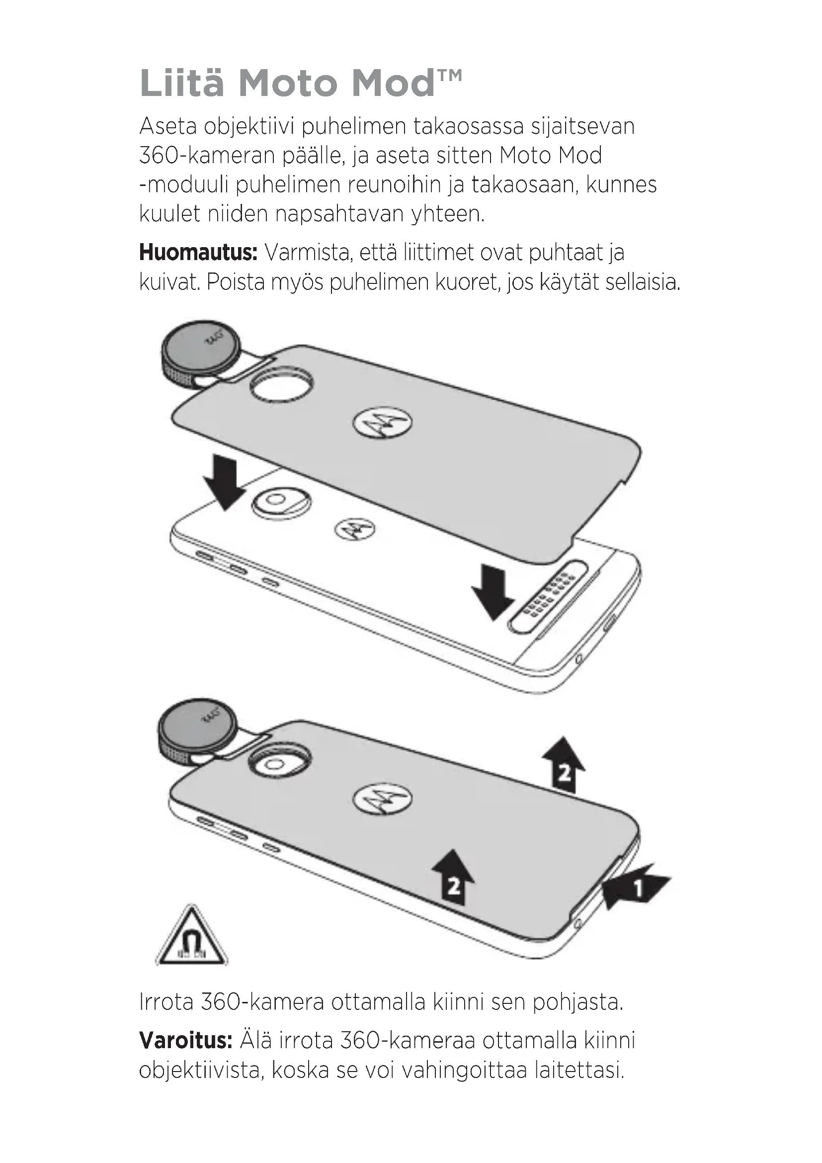 - Muokkaa: Avaa kuva ja valitse tai avaa video ja valitse . Muokkausasetukset näkyvät näytön alareunassa.360 kuvan muokkausasetukset Löydät asetukset napauttamalla . Rajaus Rajaa 360 asteen kuva tavalliseksi vakiokokoiseksi kuvaksi. Voit valita jonkin vakiokokoisista tai muokatuista vaihtoehdoista, kuten pikkuplaneettamaiseman. 360-rajaus Rajaa alkuperäisestä 360 asteen kuvasta valikoitu alue ja tee siitä mukaansatempaava 360 asteen kuva. Suodattimet Voit valita valikoimasta sopivan suodattimen. Säädä Säädä valotusta, kontrastia, värikylläisyyttä ja hue-arvoa manuaalisesti. 360 videon muokkausasetukset Löydät asetukset napauttamalla . Leikkaa Leikkaa videon pituutta. Koosta Tee yhden videon koosteen 360 asteen videoistasi. Director's Cut Valitse 360 asteen videon parhaat kohdat ja tee niistä tavallinen, ei vuorovaikutteisen videon 16:9 kuvasuhteella, jonka voi jakaa kenelle vain. Ota kuva Ota videon ruudusta 360 asteen tai tavallinen kuva.Haluatko lisätietoja? Siirry osoitteeseen www.motorola.com/mymotomods, josta löydät ohjeita, videoita ja paljon muuta.Tekijänoikeudet ja tavaramerkit Motorola Mobility LLC 222 W. Merchandise Mart Plaza Chicago, IL 60654 www.motorola.com Jotkin ominaisuudet, palvelut ja sovellukset ovat verkkokohtaisia, eivätkä ne välttämättä ole käytettävissä kaikilla alueilla. Ne voivat myös olla lisäkäyttöehtojen ja/tai lisämaksujen alaisia. Pyydä lisätietoja operaattoriltasi. Kaikki ominaisuudet, toiminnot ja tuotteen muut määritykset sekä tämän käyttöoppaan tiedot perustuvat viimeisimpiin saatavilla oleviin tietoihin, ja niiden oletetaan olevan ajan tasalla painatushetkellä. Motorola pidättää oikeuden tietojen tai ominaisuuksien muuttamiseen ilman erillistä ilmoitusta tai muita velvoitteita. Huomautus: Tämän oppaan kuvat ovat vain esimerkkejä. MOTOROLA, tyylitelty M-logo, MOTO ja MOTO-tavaramerkit ovat Motorola Trademark Holdings LLC:n tavaramerkkejä tai rekisteröityjä tavaramerkkejä. LENOVO on Lenovon tavaramerkki. Google, Android, Google Play ja muut tavaramerkit ovat Google Inc:n tavaramerkkejä. microSD-logo on SD-3C LLC:n tavaramerkki. Kaikki muut tuote- ja palvelunimet ovat omistajiensa omaisuutta. © 2017 Motorola Mobility LLC. Kaikki oikeudet pidätetään. Tuotenumero: Moto Mods 360 Camera (MD100S) käyttöopas numero: SSC8C19882-A360 CAMERA360 CAMERA Feste Moto Mod™ Rett inn kameralinsen på baksiden av telefonen med 360-kameraet, og rett deretter inn sidene og bunnen av telefonen med Moto Mod-en til de knepper sammen. Merk: Pass på at koblingene er rene og tørre. Fjern også et eventuelt mobildeksel. MD100S Fjern 360-kameraet ved å løfte det opp fra bunnen. Obs! Ikke fjern 360-kameraet ved å holde i linsen. Dette kan skade enheten.Fjerne linsedekselet Løft opp og vri av linsedekselet for å fjerne det. Obs! Du må alltid ha linsedekselet på når du ikke bruker kameraet, og du må ikke legge kameraet på et bord eller en flat overflate med mindre linsedekselet er på. Dette forhindrer at linsen ripes opp. Slå kameraet på Kameraet kan slås på på ulike måter: