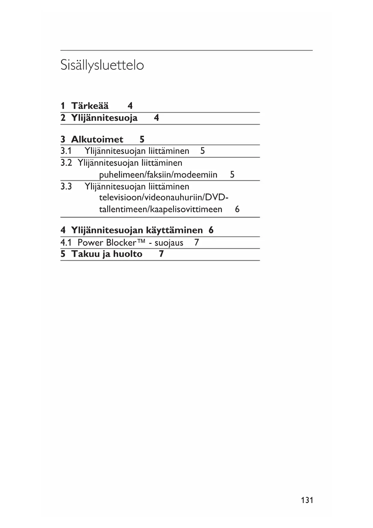 YlijännitesuojasaattaasisältääPower Blocker™-suojauksen,jokahajottaa ylijännitesuojanautomaattisestisiihen liitettyjenlaitteidensuojaamiseksi.Tämä erityinenvirtapiirikatkaiseepistorasioiden virrankokonaan,josvirtapiikkiylittää ylijännitesuojankapasiteetin. Kuntämätapahtuu,ylijännitesuojaeipäästä läpiyhtäänvirtaa.Suojauksenmerkkivalo eipala,mikäosoittaa,ettäylijännitesuoja ontehnyttehtävänsä—suojannutliitettyjä laitteita.Palautalaitteidensuojausvaihtamalla ylijännitesuojauuteen. Huomautus Niillälaitteilla,jotkaonliitettyPowerBlocker™ -suojauksensisältäväänylijännitesuojaan, onlisätakuusiltävaralta,ettäsalamavioittaa laitteita.Mikäänylijännitesuojaeisuojaa laitteitatäydellisestisuoraltasalamaniskulta. Ylijännitesuojavioittuuitsetehtävässään, javioittunutlaiteonvaihdettavauuteen. 5 Takuu ja huolto Philips,Inc.(“Philips”)tarjoaatoisentai molemmatseuraavistatakuista(Ylijännitesuojan rajoitettutakuutaiLiitettyjenlaitteiden rajoitettutakuu)Philips-tuotenimellämyytyjen ylijännitesuojienalkuperäiselleostajalle. Kumpaakintakuutakoskevatehdot Nämätakuutkoskevatvainhenkilöasiakkaita, jotkaovatostaneetylijännitesuojanomaan käyttöönsätaiperheentaitaloudenkäyttöön; takuuteivätkoskekaupallisiatailaitos-tai teollisuusasiakkaita.Nämätakuutovat voimassavainEuroopassa.