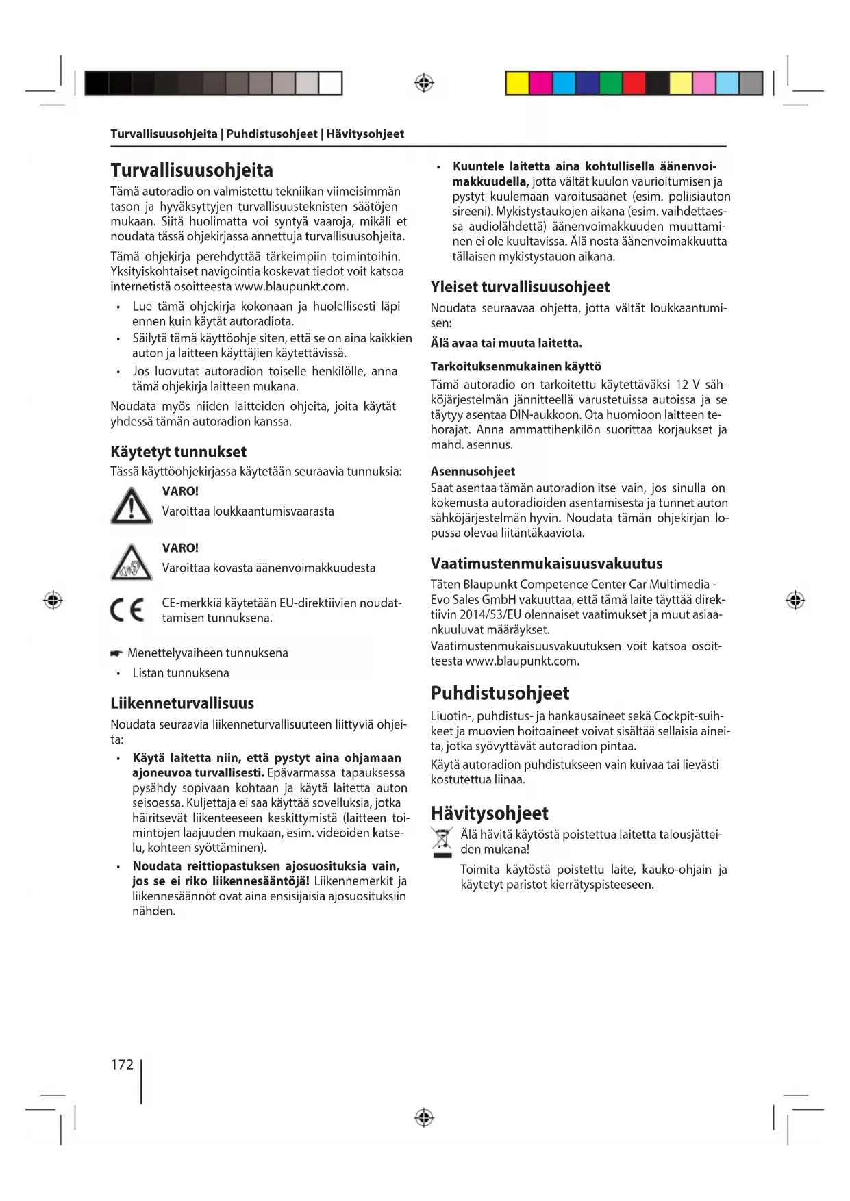 SUOMITurvallisuusohjeita | Puhdistusohjeet | Hävitysohjeet Turvallisuusohjeita Tämä autoradio on valmistettu tekniikan viimeisimmän tason ja hyväksyttyjen turvallisuusteknisten säätöjen mukaan. Siitä huolimatta voi syntyä vaaroja, mikäli et noudata tässä ohjekirjassa annettuja turvallisuusohjeita. Tämä ohjekirja perehdyttää tärkeimpiin toimintoihin. Yksityiskohtaiset navigointia koskevat tiedot voit katsoa internetistä osoitteesta www.blaupunkt.com.