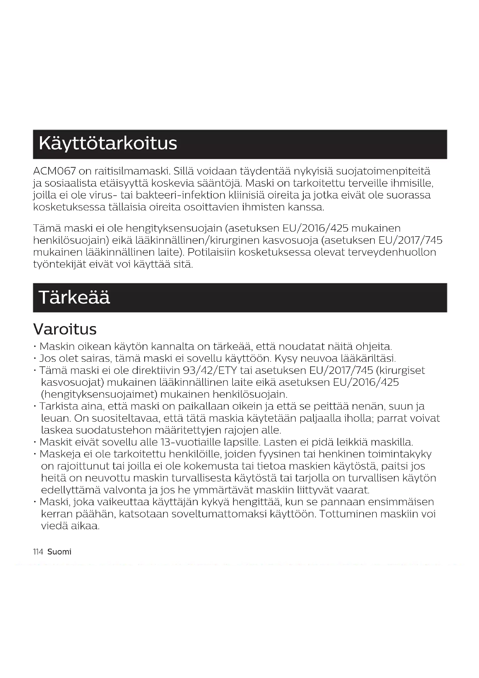 - Magneettien tuottamat sähkömagneettiset kentät ja maski voivat häiritä lääkinnällisiä laitteita (kuten kuuloelinimplantteja). AMC067-AirMasks_3000.062.5277.2_BOOKLET_120x120mm_BW.indd 114AMC067-AirMasks_3000.062.5277.2_BOOKLET_120x120mm_BW.indd 114 01-03-21 11:2601-03-21 11:26Suomi 115 Käyttötarkoitus ACM067 on raitisilmamaski. Sillä voidaan täydentää nykyisiä suojatoimenpiteitä ja sosiaalista etäisyyttä koskevia sääntöjä. Maski on tarkoitettu terveille ihmisille, joilla ei ole virus- tai bakteeri-infektion kliinisiä oireita ja jotka eivät ole suorassa kosketuksessa tällaisia oireita osoittavien ihmisten kanssa. Tämä maski ei ole hengityksensuojain (asetuksen EU/2016/425 mukainen henkilösuojain) eikä lääkinnällinen/kirurginen kasvosuoja (asetuksen EU/2017/745 mukainen lääkinnällinen laite). Potilaisiin kosketuksessa olevat terveydenhuollon työntekijät eivät voi käyttää sitä. Tärkeää Varoitus
