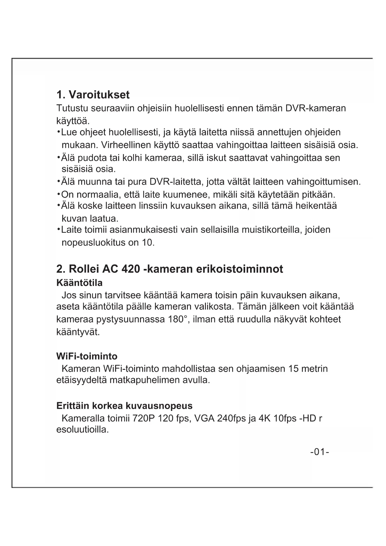 Kääntötila Jos sinun tarvitsee kääntää kamera toisin päin kuvauksen aikana, aseta kääntötila päälle kameran valikosta. Tämän jälkeen voit kääntää kameraa pystysuunnassa 180°, ilman että ruudulla näkyvät kohteet kääntyvät. WiFi-toiminto Kameran WiFi-toiminto mahdollistaa sen ohjaamisen 15 metrin etäisyydeltä matkapuhelimen avulla. Erittäin korkea kuvausnopeus Kameralla toimii 720P 120 fps, VGA 240fps ja 4K 10fps -HD r esoluutioilla. -01-Slow Motion -toiminto Kuvatut videot on mahdollista toistaa kaksi kertaa (60fps) tai 4 kertaa (120fps) kuvattua hitaammalla nopeudella. Intervallikuvaus (Time Lapse -toiminto) Tällä toiminnolla DVR-kamera ottaa valokuvia sarjana, käyttäjän itse määrittämin väliajoin. Kuvauksen päätyttyä laite kokoaa kuvat videomuotoon. Pysäytyskuvatila Kuvauksen ollessa käynnissä, voit ottaa pysäytyskuvan painamalla Tila-painiketta. Manuaalisten pysäytyskuvien ohella laitteen voi asettaa ottamaan pysäytyskuvia myös automaattisesti, mikä tekee niiden ottamisesta erittäin helppoa.