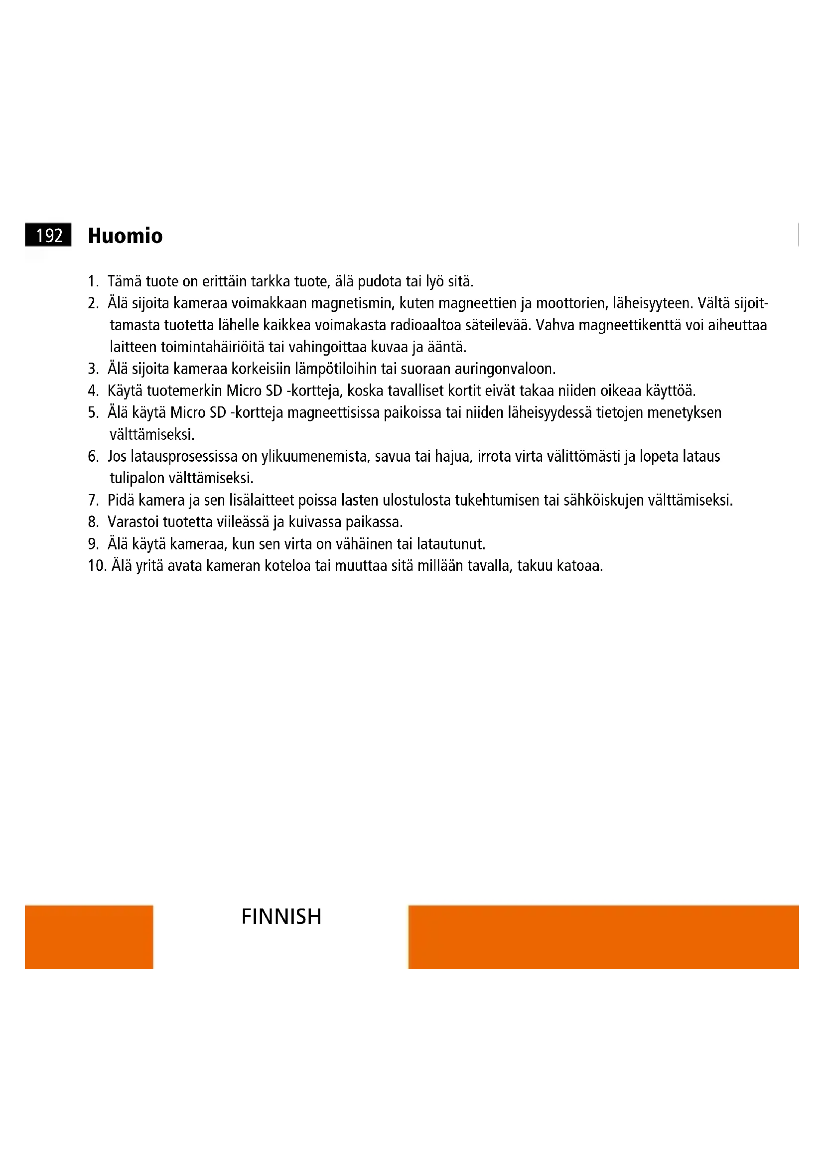 10. Älä yritä avata kameran koteloa tai muuttaa sitä millään tavalla, takuu katoaa.193