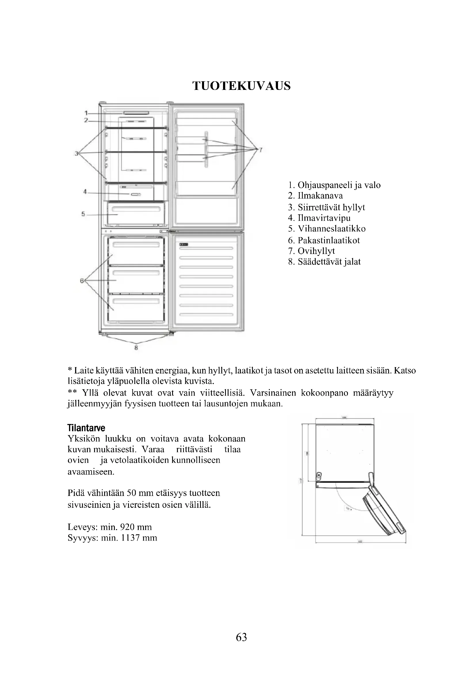 - Laite käyttää vähiten energiaa, kun hyllyt, laatikot ja tasot on asetettu laitteen sisään. Katso lisätietoja yläpuolella olevista kuvista. ** Yllä olevat kuvat ovat vain viitteellisiä. Varsinainen kokoonpano määräytyy jälleenmyyjän fyysisen tuotteen tai lausuntojen mukaan. Tilantarve Yksikön luukku on voitava avata kokonaan kuvan mukaisesti. Varaa riittävästi tilaa ovien ja vetolaatikoiden kunnolliseen avaamiseen. Pidä vähintään 50 mm etäisyys tuotteen sivuseinien ja viereisten osien välillä. Leveys: min. 920 mm Syvyys: min. 1137 mm64 KÄYTTÖ ON/OFF-painike, jolla laite kytketään päälle/pois. SET-asetuspainike, jolla säädetään lämpötilaa tai valitaan Super Cool - toiminto. Super Cool -kuvake, näyttää, onko toiminto aktivoitu.