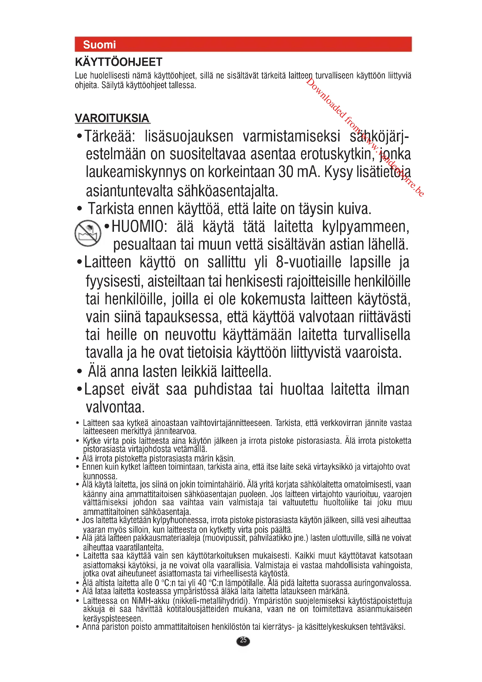 - HUOMIO: älä käytä tätä laitetta kylpyammeen, pesualtaan tai muun vettä sisältävän astian lähellä.