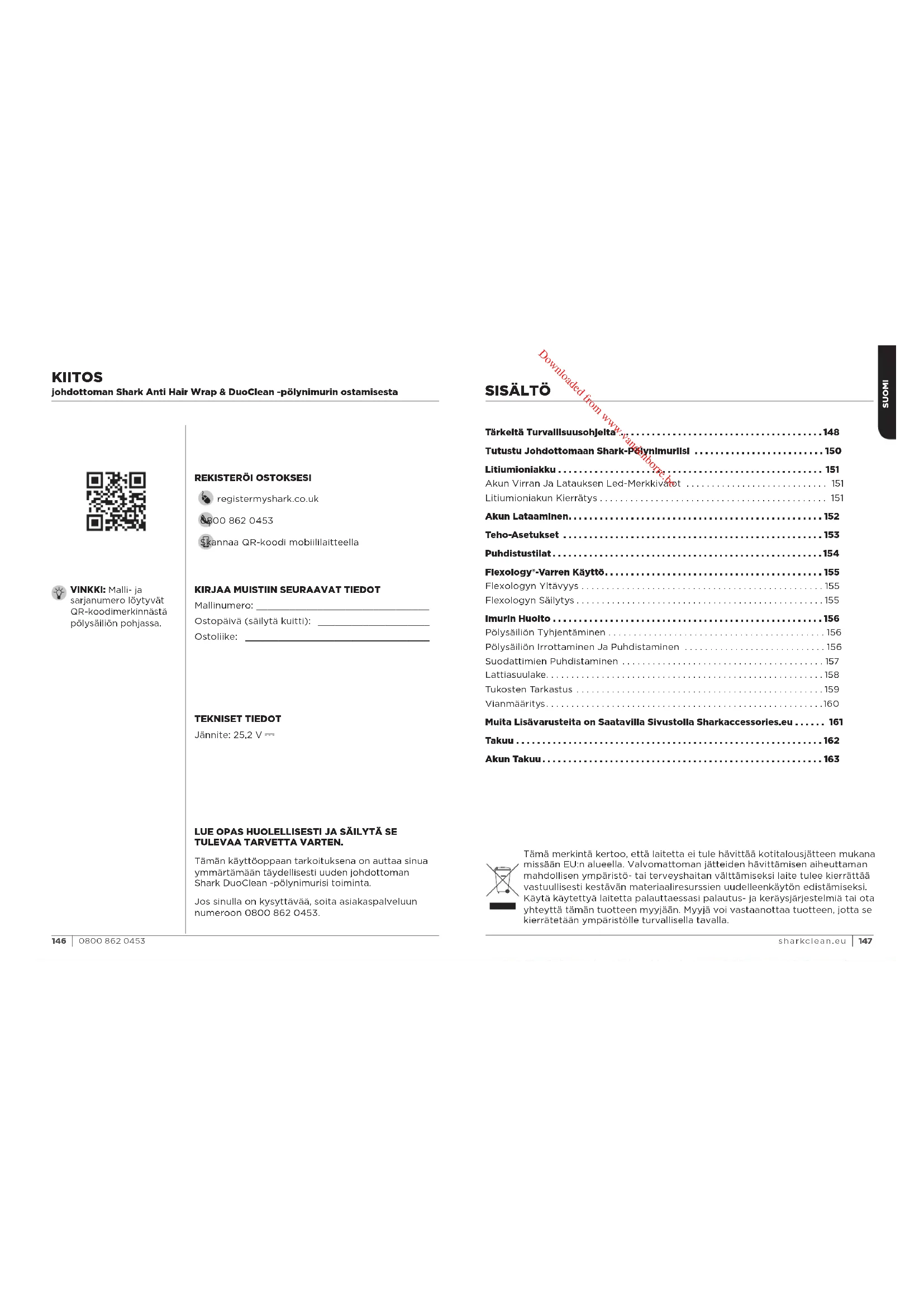 at reparasjonene eller endringene utført av andre ikke er relatert til den defekten du gjør batterigarantien gjeldende f or. Problemer med batteriet Hvis lithium-ion-batteriet ikke fungerer som det skal ved bruk ved normale husholdnings-forhold i garantiperioden, du finner online-støtte på www.sharkclean.eu NORSK 144 1450800 862 0453 sharkclean.eu Downloaded from www.vandenborre.beTämä merkintä kertoo, että laitetta ei tule hävittää kotitalousjätteen mukana missään EU:n alueella. Valvomattoman jätteiden hävittämisen aiheuttaman mahdollisen ympäristö- tai terveyshaitan välttämiseksi laite tulee kierrättää vastuullisesti kestävän materiaaliresurssien uudelleenkäytön edistämiseksi. Käytä käytettyä laitetta palauttaessasi palautus- ja keräysjärjestelmiä tai ota yhteyttä tämän tuotteen myyjään. Myyjä voi vastaanottaa tuotteen, jotta se kierrätetään ympäristölle turvallisella tavalla. LUE OPAS HUOLELLISESTI JA SÄILYTÄ SE TULEVAA TARVETTA VARTEN. Tämän käyttöoppaan tarkoituksena on auttaa sinua ymmärtämään täydellisesti uuden johdottoman Shark DuoClean -pölynimurisi toiminta. Jos sinulla on kysyttävää, soita asiakaspalveluun numeroon 0800 862 0453. TEKNISET TIEDOT Jännite: 25,2 V VINKKI: Malli- ja sarjanumero löytyvät QR-koodimerkinnästä pölysäiliön pohjassa.