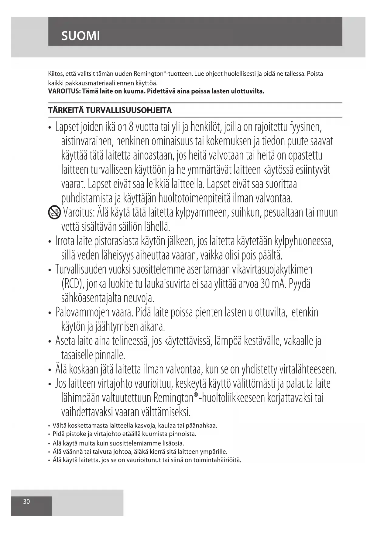 - Jos laitteen virtajohto vaurioituu, keskeytä käyttö välittömästi ja palauta laite lähimpään valtuutettuun Remington®-huoltoliikkeeseen korjattavaksi tai vaihdettavaksi vaaran välttämiseksi.