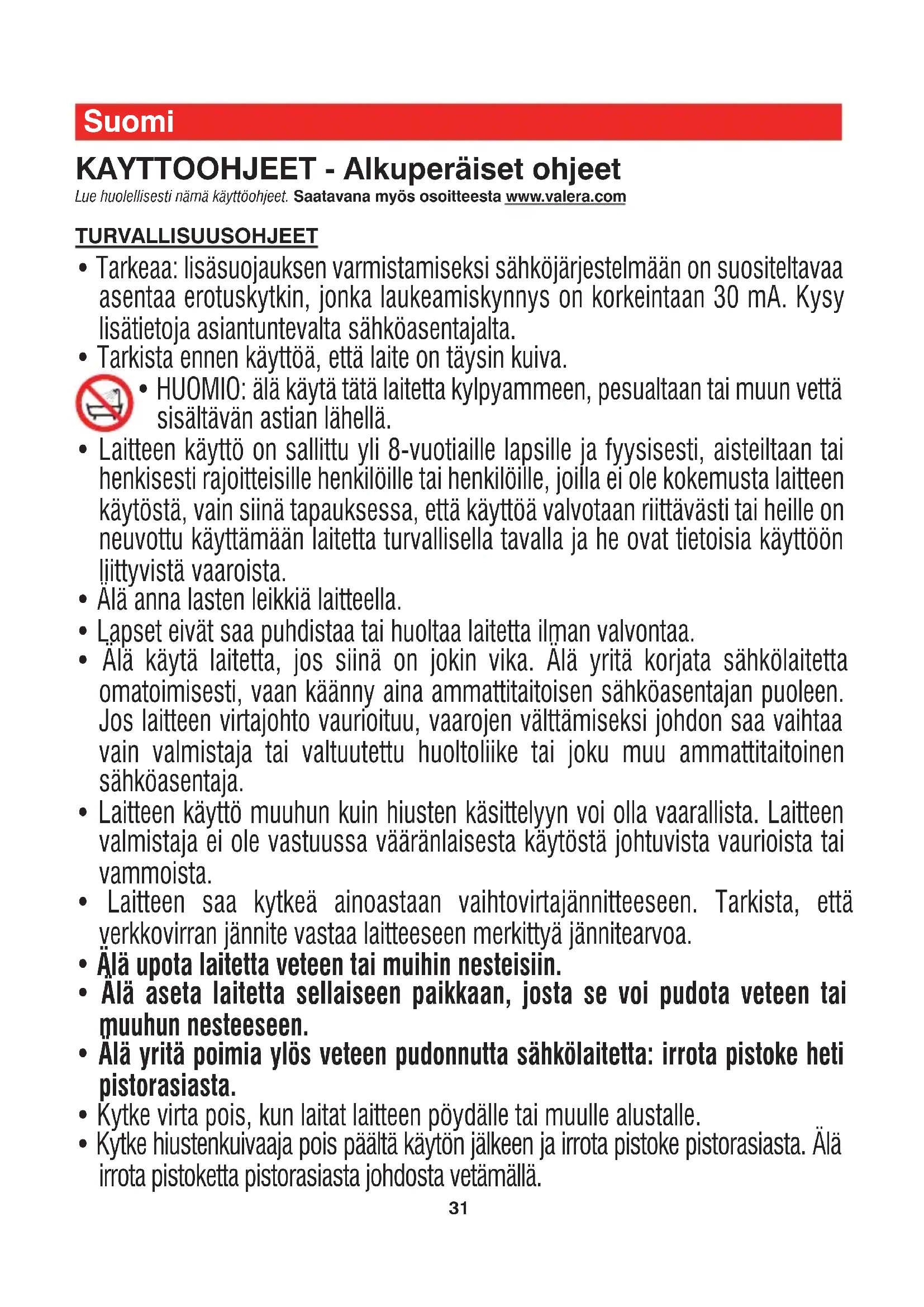 - Älä yritä poimia ylös veteen pudonnutta sähkölaitetta: irrota pistoke heti pistorasiasta.