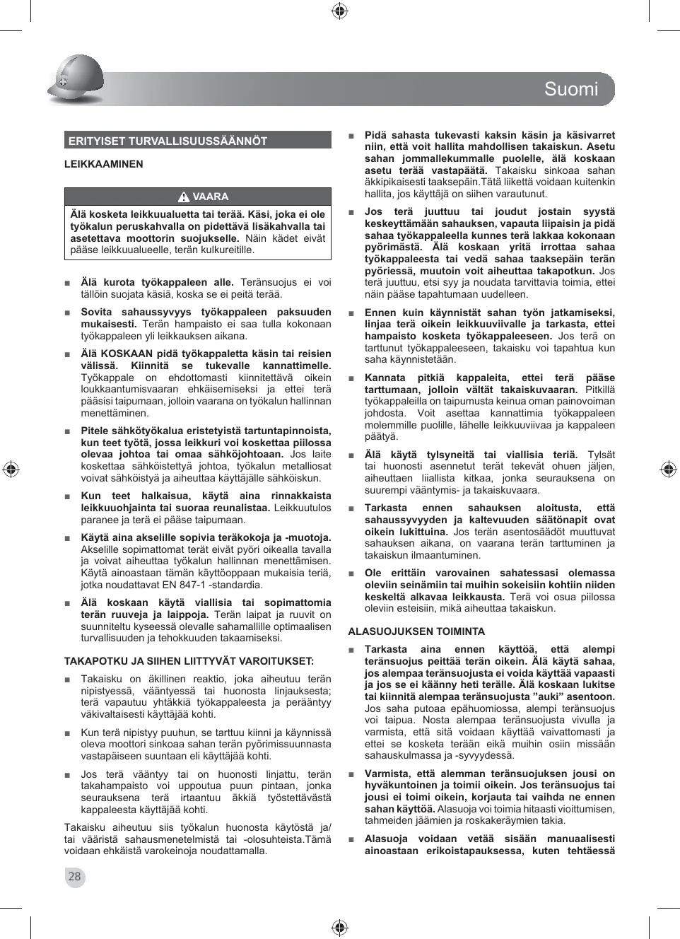 ERITYISET TURVALLISUUSSÄÄNNÖT LEIKKAAMINEN VAARA Älä kosketa leikkuualuetta tai terää. Käsi, joka ei ole työkalun peruskahvalla on pidettävä lisäkahvalla tai asetettava moottorin suojukselle. Näin kädet eivät pääse leikkuualueelle, terän kulkureitille. ■