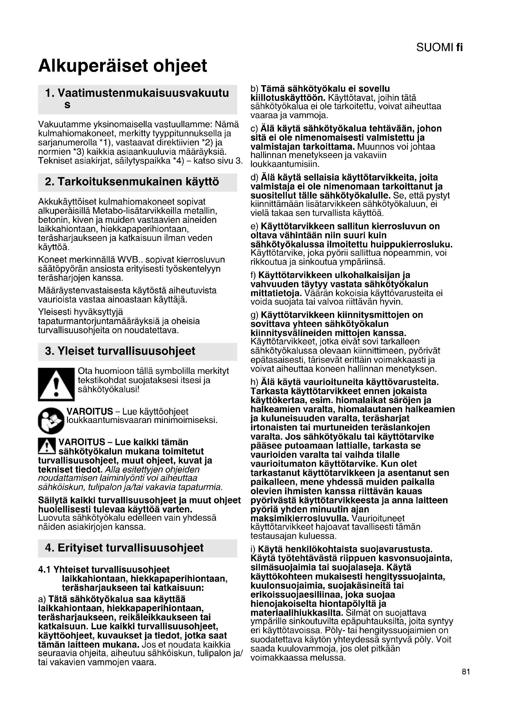 Alkuperäiset ohjeet Vakuutamme yksinomaisella vastuullamme: Nämä kulmahiomakoneet, merkitty tyyppitunnuksella ja sarjanumerolla *1), vastaavat direktiivien *2) ja normien *3) kaikkia asiaankuuluvia määräyksiä. Tekniset asiakirjat, säilytyspaikka *4) – katso sivu 3. Akkukäyttöiset kulmahiomakoneet sopivat alkuperäisillä Metabo-lisätarvikkeilla metallin, betonin, kiven ja muiden vastaavien aineiden laikkahiontaan, hiekkapaperihiontaan, teräsharjaukseen ja katkaisuun ilman veden käyttöä. Koneet merkinnällä WVB.. sopivat kierrosluvun säätöpyörän ansiosta erityisesti työskentelyyn teräsharjojen kanssa. Määräystenvastaisesta käytöstä aiheutuvista vaurioista vastaa ainoastaan käyttäjä. Yleisesti hyväksyttyjä tapaturmantorjuntamääräyksiä ja oheisia turvallisuusohjeita on noudatettava. Ota huomioon tällä symbolilla merkityt tekstikohdat suojataksesi itsesi ja sähkötyökalusi! VAROITUS – Lue käyttöohjeet loukkaantumisvaaran minimoimiseksi. VAROITUS – Lue kaikki tämän sähkötyökalun mukana toimitetut turvallisuusohjeet, muut ohjeet, kuvat ja tekniset tiedot. Alla esitettyjen ohjeiden noudattamisen laiminlyönti voi aiheuttaa sähköiskun, tulipalon ja/tai vakavia tapaturmia. Säilytä kaikki turvallisuusohjeet ja muut ohjeet huolellisesti tulevaa käyttöä varten. Luovuta sähkötyökalu edelleen vain yhdessä näiden asiakirjojen kanssa.
