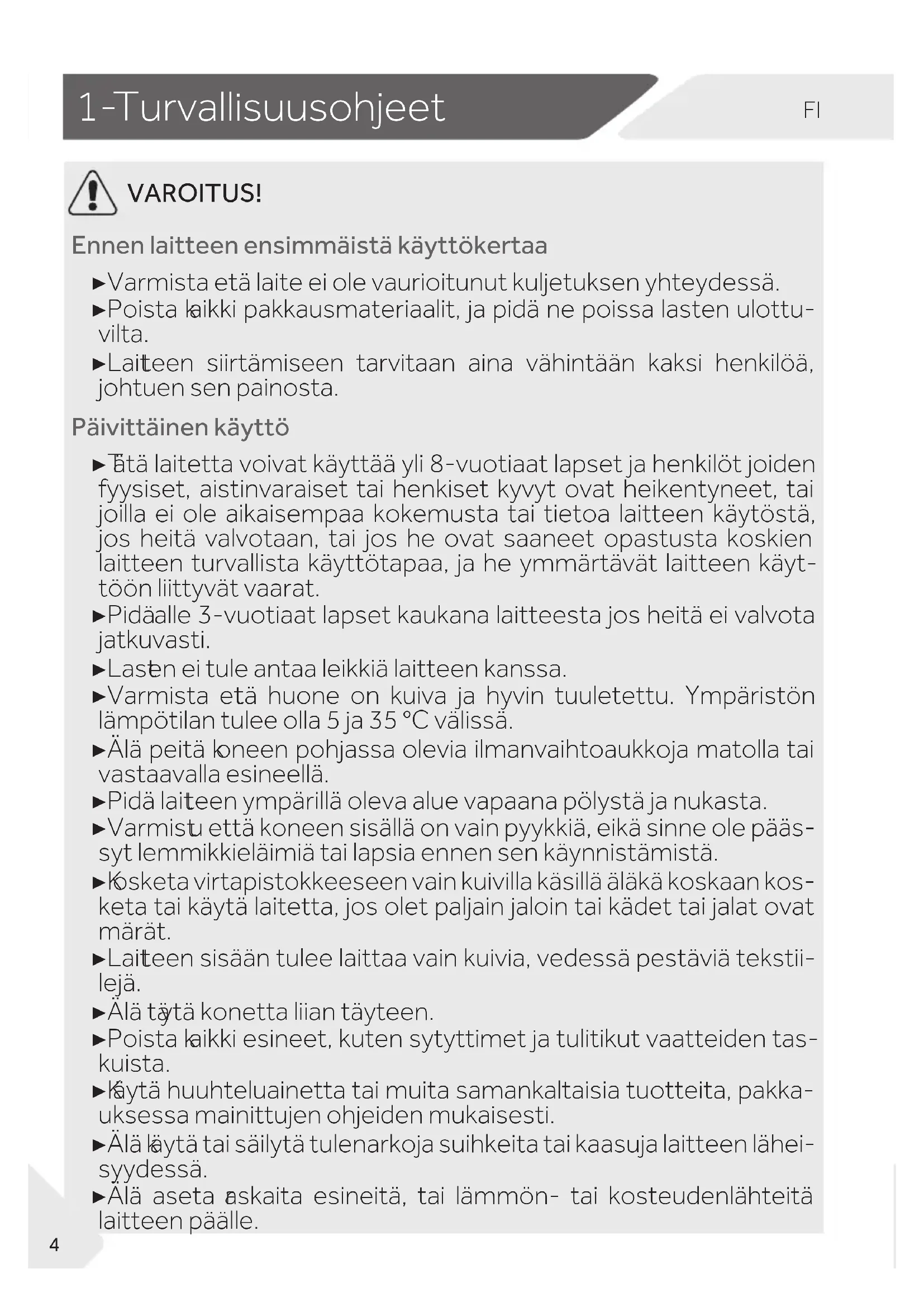 VAROITUS! Ennen laitteen ensimmäistä käyttökertaa ▶ Varmista et tä laite ei ole vaurioitunut kuljetuksen yhteydessä. ▶ Poista k aikki pakkausmateriaalit, ja pidä ne poissa lasten ulottu- vilta. ▶ Lait teen siirtämiseen tarvitaan aina vähintään kaksi henkilöä, johtuen sen painosta. Päivittäinen käyttö ▶ T ätä laitetta voivat käyttää yli 8-vuotiaat lapset ja henkilöt joiden fyysiset, aistinvaraiset tai henkiset kyvyt ovat heikentyneet, tai joilla ei ole aikaisempaa kokemusta tai tietoa laitteen käytöstä, jos heitä valvotaan, tai jos he ovat saaneet opastusta koskien laitteen turvallista käyttötapaa, ja he ymmärtävät laitteen käyt- töön liittyvät vaarat. ▶ Pidä alle 3-vuotiaat lapset kaukana laitteesta jos heitä ei valvota jatkuvasti. ▶ Last en ei tule antaa leikkiä laitteen kanssa. ▶ Varmista et tä huone on kuiva ja hyvin tuuletettu. Ympäristön lämpötilan tulee olla 5 ja 35 °C välissä. ▶ Älä peitä k oneen pohjassa olevia ilmanvaihtoaukkoja matolla tai vastaavalla esineellä. ▶ Pidä lait teen ympärillä oleva alue vapaana pölystä ja nukasta. ▶ Varmist u että koneen sisällä on vain pyykkiä, eikä sinne ole pääs- syt lemmikkieläimiä tai lapsia ennen sen käynnistämistä. ▶ K osketa virtapistokkeeseen vain kuivilla käsillä äläkä koskaan kos- keta tai käytä laitetta, jos olet paljain jaloin tai kädet tai jalat ovat märät. ▶ Lait teen sisään tulee laittaa vain kuivia, vedessä pestäviä tekstii- lejä. ▶ Älä tä ytä konetta liian täyteen. ▶ Poista k aikki esineet, kuten sytyttimet ja tulitikut vaatteiden tas- kuista. ▶ K äytä huuhteluainetta tai muita samankaltaisia tuotteita, pakka- uksessa mainittujen ohjeiden mukaisesti. ▶ Älä k äytä tai säilytä tulenarkoja suihkeita tai kaasuja laitteen lähei- syydessä. ▶ Älä aseta r askaita esineitä, tai lämmön- tai kosteudenlähteitä laitteen päälle.FI