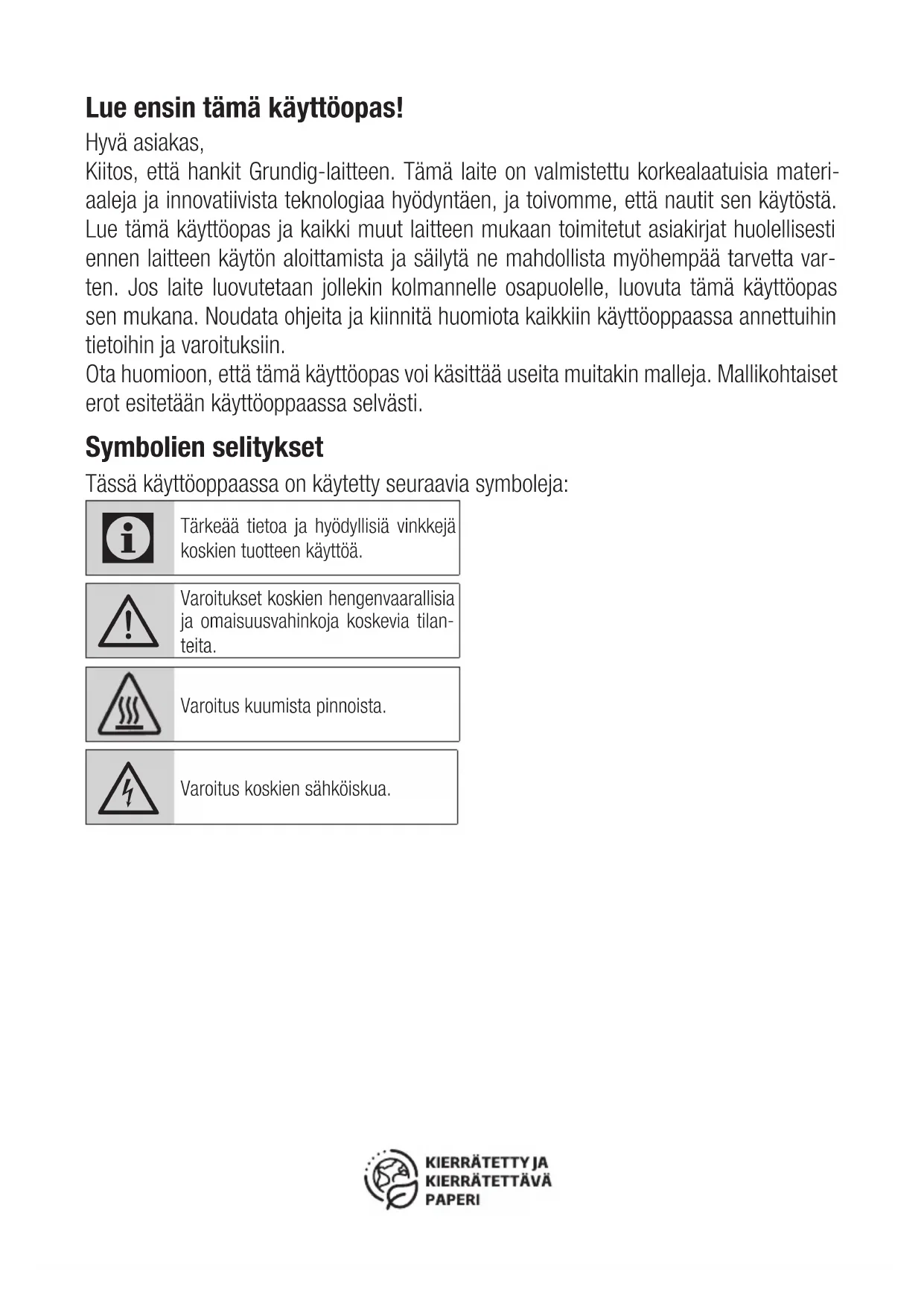 - Hvis apparatet mistes, f.eks. i gulvet, kan det slutte å virke eller få permanente skader. 5 Rengjøring og vedlikeholdLue ensin tämä käyttöopas! Hyvä asiakas, Kiitos, että hankit Grundig-laitteen. Tämä laite on valmistettu korkealaatuisia materi- aaleja ja innovatiivista teknologiaa hyödyntäen, ja toivomme, että nautit sen käytöstä. Lue tämä käyttöopas ja kaikki muut laitteen mukaan toimitetut asiakirjat huolellisesti ennen laitteen käytön aloittamista ja säilytä ne mahdollista myöhempää tarvetta var- ten. Jos laite luovutetaan jollekin kolmannelle osapuolelle, luovuta tämä käyttöopas sen mukana. Noudata ohjeita ja kiinnitä huomiota kaikkiin käyttöoppaassa annettuihin tietoihin ja varoituksiin. Ota huomioon, että tämä käyttöopas voi käsittää useita muitakin malleja. Mallikohtaiset erot esitetään käyttöoppaassa selvästi. Symbolien selitykset Tässä käyttöoppaassa on käytetty seuraavia symboleja: