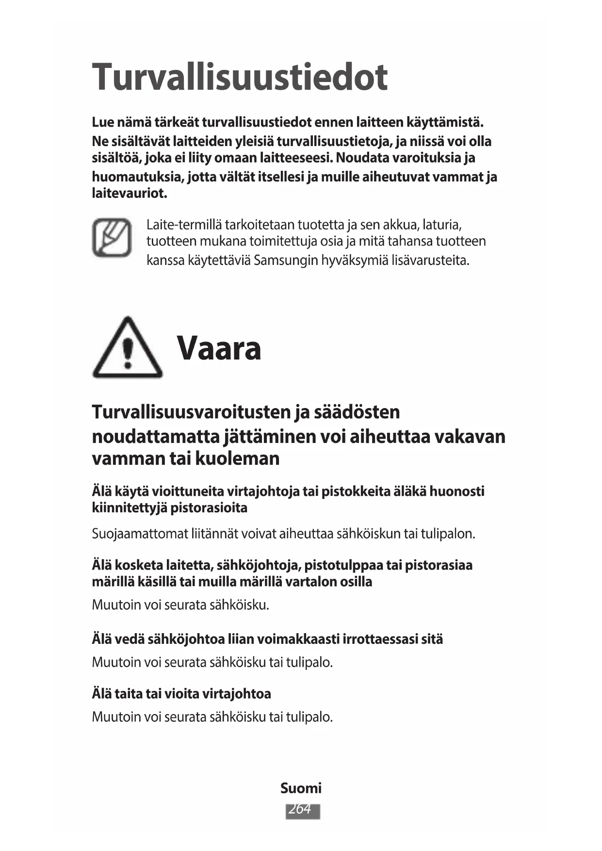 Turvallisuustiedot Lue nämä tärkeät turvallisuustiedot ennen laitteen käyttämistä. Ne sisältävät laitteiden yleisiä turvallisuustietoja, ja niissä voi olla sisältöä, joka ei liity omaan laitteeseesi. Noudata varoituksia ja huomautuksia, jotta vältät itsellesi ja muille aiheutuvat vammat ja laitevauriot. Laite-termillä tarkoitetaan tuotetta ja sen akkua, laturia, tuotteen mukana toimitettuja osia ja mitä tahansa tuotteen kanssa käytettäviä Samsungin hyväksymiä lisävarusteita. Vaara Turvallisuusvaroitusten ja säädösten noudattamatta jättäminen voi aiheuttaa vakavan vamman tai kuoleman Älä käytä vioittuneita virtajohtoja tai pistokkeita äläkä huonosti kiinnitettyjä pistorasioita Suojaamattomat liitännät voivat aiheuttaa sähköiskun tai tulipalon. Älä kosketa laitetta, sähköjohtoja, pistotulppaa tai pistorasiaa märillä käsillä tai muilla märillä vartalon osilla Muutoin voi seurata sähköisku. Älä vedä sähköjohtoa liian voimakkaasti irrottaessasi sitä Muutoin voi seurata sähköisku tai tulipalo. Älä taita tai vioita virtajohtoa Muutoin voi seurata sähköisku tai tulipalo.Suomi