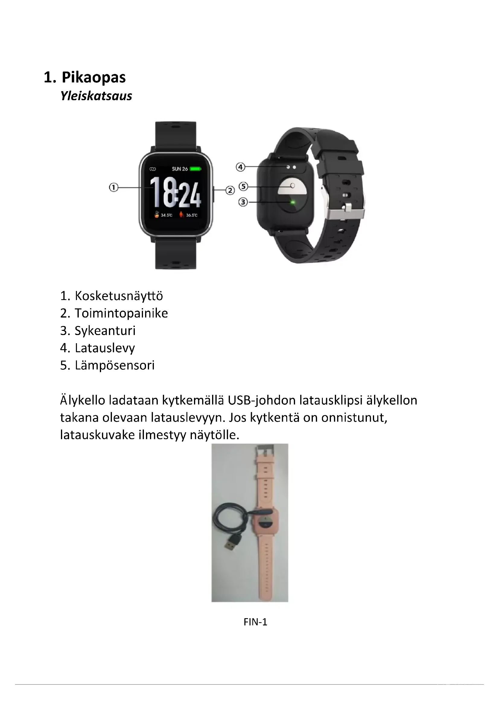 Älykello ladataan kytkemällä USB-johdon latausklipsi älykellon takana olevaan latauslevyyn. Jos kytkentä on onnistunut, latauskuvake ilmestyy näytölle.FIN-2