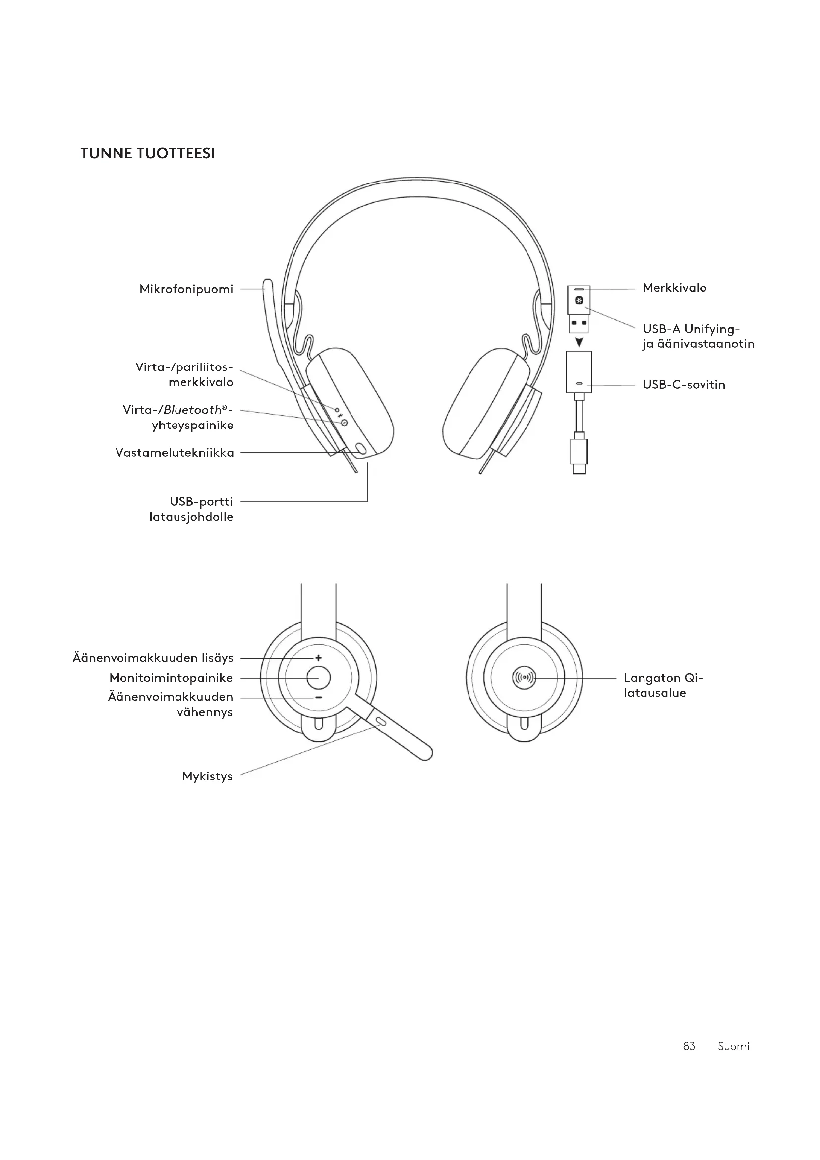 yhteyspainike USB-portti latausjohdolle USB-C-sovitin Merkkivalo USB-A Unifying- jaäänivastaanotin Äänenvoimakkuuden lisäys Äänenvoimakkuuden vähennys Mykistys Monitoimintopainike Langaton Qi- latausalue 83 SuomiUSB-A USB-C ADAPTER USB-A | USB-C Logi Zone