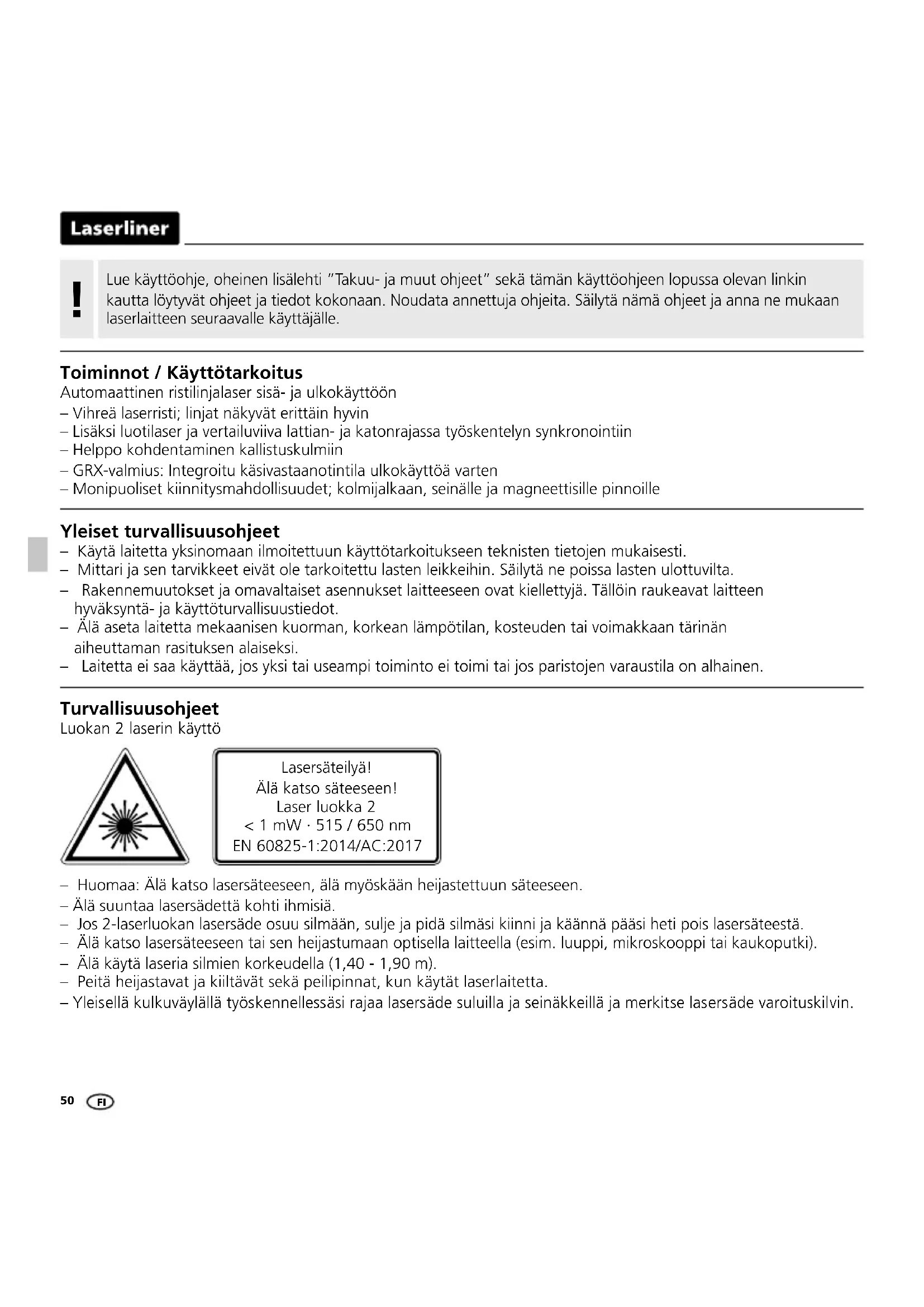- przy maks. 300 luksów PL50 Lue käyttöohje, oheinen lisälehti ”Takuu- ja muut ohjeet” sekä tämän käyttöohjeen lopussa olevan linkin kautta löytyvät ohjeet ja tiedot kokonaan. Noudata annettuja ohjeita. Säilytä nämä ohjeet ja anna ne mukaan laserlaitteen seuraavalle käyttäjälle.