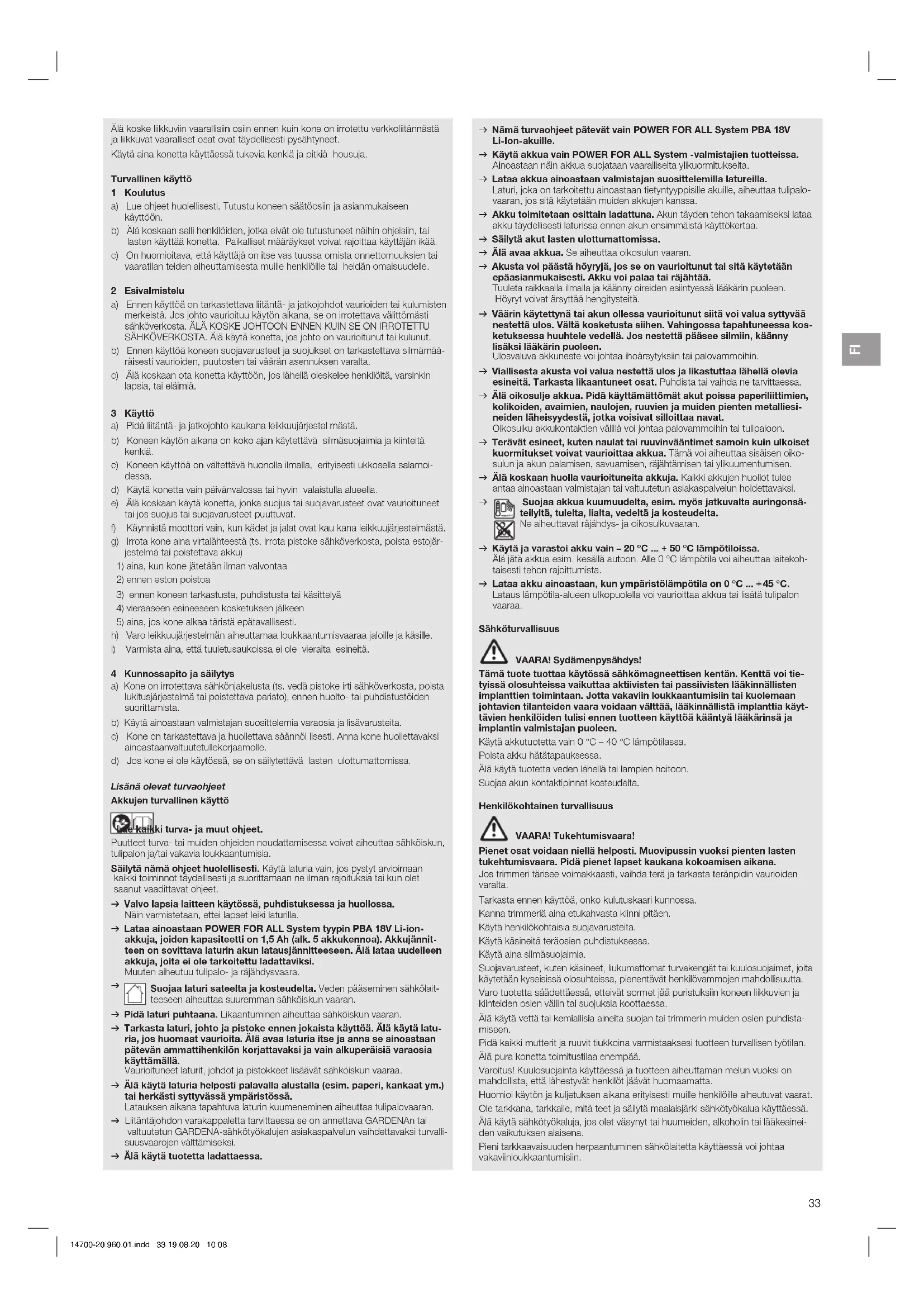 Suojaa laturi sateelta ja kosteudelta. Veden pääseminen sähkölait- teeseen aiheuttaa suuremman sähköiskun vaaran. v Pidä laturi puhtaana. Likaantuminen aiheuttaa sähköiskun vaaran. v Tarkasta laturi, johto ja pistoke ennen jokaista käyttöä. Älä käytä latu- ria, jos huomaat vaurioita. Älä avaa laturia itse ja anna se ainoastaan pätevän ammattihenkilön korjattavaksi ja vain alkuperäisiä varaosia käyttämällä. Vaurioituneet laturit, johdot ja pistokkeet lisäävät sähköiskun vaaraa. v Älä käytä laturia helposti palavalla alustalla (esim. paperi, kankaat ym.) tai herkästi syttyvässä ympäristössä. Latauksen aikana tapahtuva laturin kuumeneminen aiheuttaa tulipalovaaran. v Liitäntäjohdon varakappaletta tarvittaessa se on annettava GARDENAn tai valtuutetun GARDENA-sähkötyökalujen asiakaspalvelun vaihdettavaksi turvalli- suusvaarojen välttämiseksi. v Älä käytä tuotetta ladattaessa. v Nämä turvaohjeet pätevät vain POWER FOR ALL System PBA 18V Li-Ion-akuille. v Käytä akkua vain POWER FOR ALL System -valmistajien tuotteissa. Ainoastaan näin akkua suojataan vaaralliselta ylikuormitukselta. v Lataa akkua ainoastaan valmistajan suosittelemilla latureilla. Laturi, joka on tarkoitettu ainoastaan tietyntyyppisille akuille, aiheuttaa tulipalo- vaaran, jos sitä käytetään muiden akkujen kanssa. v Akku toimitetaan osittain ladattuna. Akun täyden tehon takaamiseksi lataa akku täydellisesti laturissa ennen akun ensimmäistä käyttökertaa. v Säilytä akut lasten ulottumattomissa. v Älä avaa akkua. Se aiheuttaa oikosulun vaaran. v Akusta voi päästä höyryjä, jos se on vaurioitunut tai sitä käytetään epäasianmukaisesti. Akku voi palaa tai räjähtää. Tuuleta raikkaalla ilmalla ja käänny oireiden esiintyessä lääkärin puoleen. Höyryt voivat ärsyttää hengitysteitä. v Väärin käytettynä tai akun ollessa vaurioitunut siitä voi valua syttyvää nestettä ulos. Vältä kosketusta siihen. Vahingossa tapahtuneessa kos- ketuksessa huuhtele vedellä. Jos nestettä pääsee silmiin, käänny lisäksi lääkärin puoleen. Ulosvaluva akkuneste voi johtaa ihoärsytyksiin tai palovammoihin. v Viallisesta akusta voi valua nestettä ulos ja likastuttaa lähellä olevia esineitä. Tarkasta likaantuneet osat. Puhdista tai vaihda ne tarvittaessa. v Älä oikosulje akkua. Pidä käyttämättömät akut poissa paperiliittimien, kolikoiden, avaimien, naulojen, ruuvien ja muiden pienten metalliesi- neiden läheisyydestä, jotka voisivat silloittaa navat. Oikosulku akkukontaktien välillä voi johtaa palovammoihin tai tulipaloon. v Terävät esineet, kuten naulat tai ruuvinvääntimet samoin kuin ulkoiset kuormitukset voivat vaurioittaa akkua. Tämä voi aiheuttaa sisäisen oiko- sulun ja akun palamisen, savuamisen, räjähtämisen tai ylikuumentumisen. v Älä koskaan huolla vaurioituneita akkuja. Kaikki akkujen huollot tulee antaa ainoastaan valmistajan tai valtuutetun asiakaspalvelun hoidettavaksi.