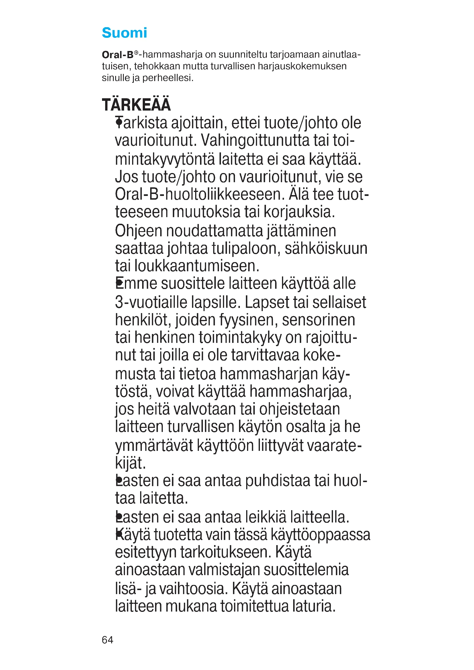 Emme suosittele laitteen käyttöä alle 3-vuotiaille lapsille. Lapset tai sellaiset henkilöt, joiden fyysinen, sensorinen tai henkinen toimintakyky on rajoittu- nut tai joilla ei ole tarvittavaa koke- musta tai tietoa hammasharjan käy- töstä, voivat käyttää hammasharjaa, jos heitä valvotaan tai ohjeistetaan laitteen turvallisen käytön osalta ja he ymmärtävät käyttöön liittyvät vaarate- kijät.