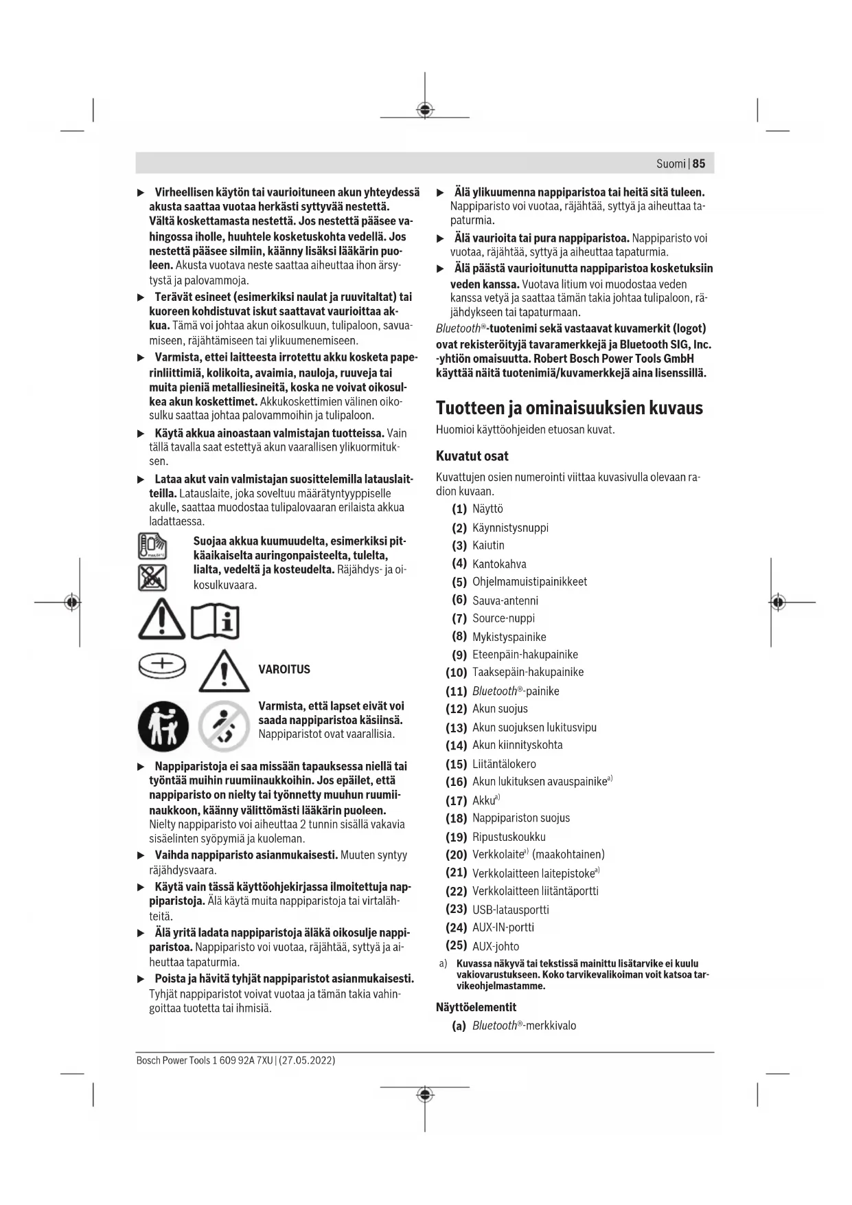 Kuvassa näkyvä tai tekstissä mainittu lisätarvike ei kuulu vakiovarustukseen. Koko tarvikevalikoiman voit katsoa tar- vikeohjelmastamme. Näyttöelementit (a) Bluetooth®-merkkivalo Bosch Power Tools 1 609 92A 7XU | (27.05.2022)86 | Suomi (b) Audiolähteen näyttö (c) Muistipaikan näyttö (d) Radiotaajuuden näyttö (GPB18V‑2C) (e) Valikkotoiminnon näyttö (f) Taukonäyttö (g) Mykistyksen näyttö (h) Stereovastaanoton näyttö (i) Akun lataustilan näyttö (j) Kellonajan näyttö (k) Monitoiminäyttö (GPB18V‑2SC) Tekniset tiedot Työmaaradio GPB 18V-2 C GPB 18V-2 SC Tuotenumero 3601DA30.. 3601DA31.. DAB+-vastaanotto – ● Käyttöjännite – verkkolaitekäytössä V 18 18 – akkukäytössä V 18 18 Vahvistimen nimellisteho W 2×7,5 2×7,5 ULA-vastaanottoalue MHz 87,5−108 87,5−108 DAB+-vastaanottoalue MHz − 174,928−239,200 Bluetooth®-yhteensopivuus Bluetooth® Spec.5 Bluetooth® Spec.5 Bluetooth®-käyttötaajuusalue MHz 2402−2480 2402−2480 Bluetooth®-yhteyden suurin lähetysteho mW 10 10 Nappiparisto (puskuriparisto) CR2032 3V:n litiumparisto CR2032 3V:n litiumparisto Paino EPTA-Procedure01:2014 -ohjeiden mukaan kg 2,8−3,9
